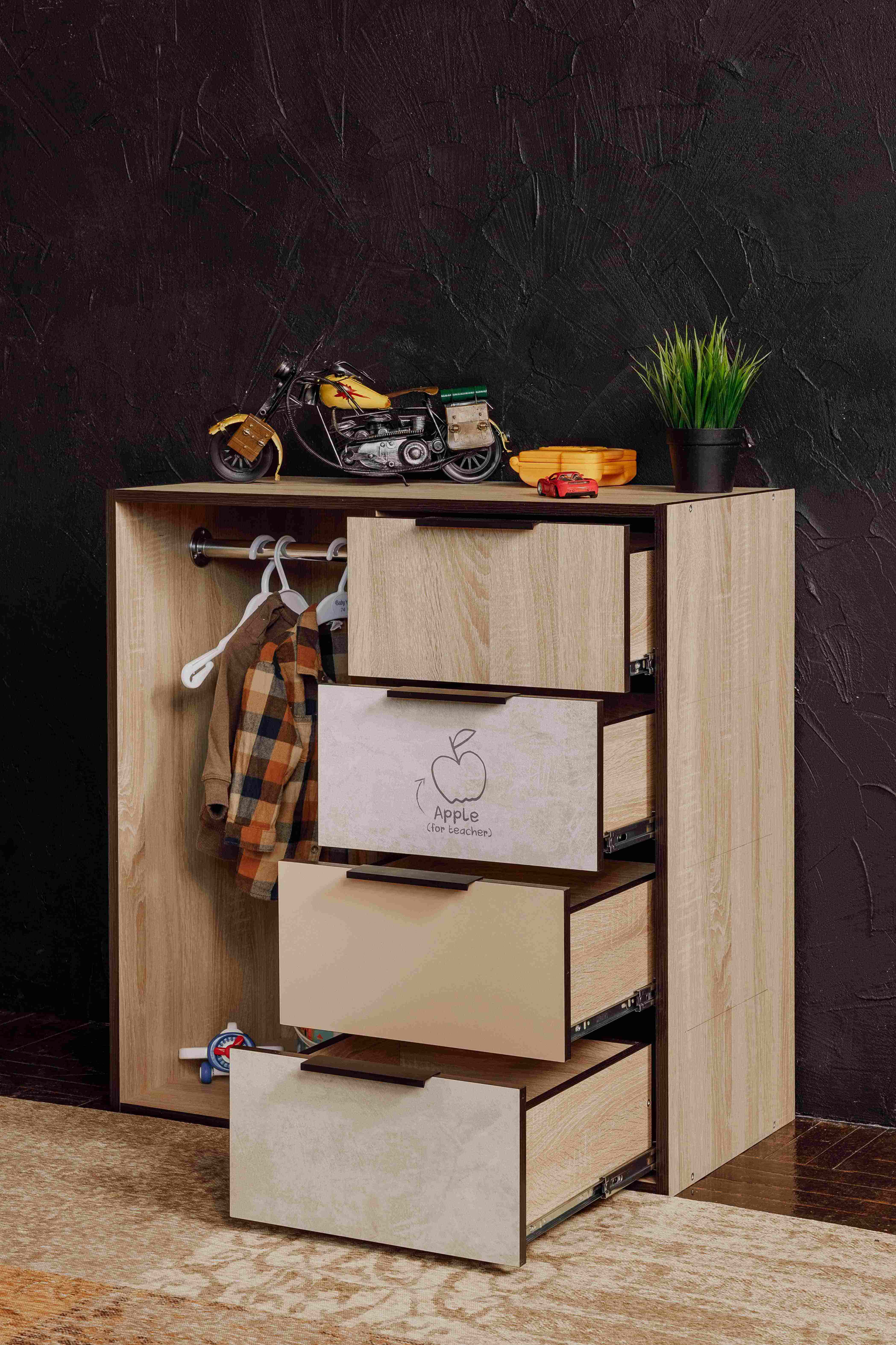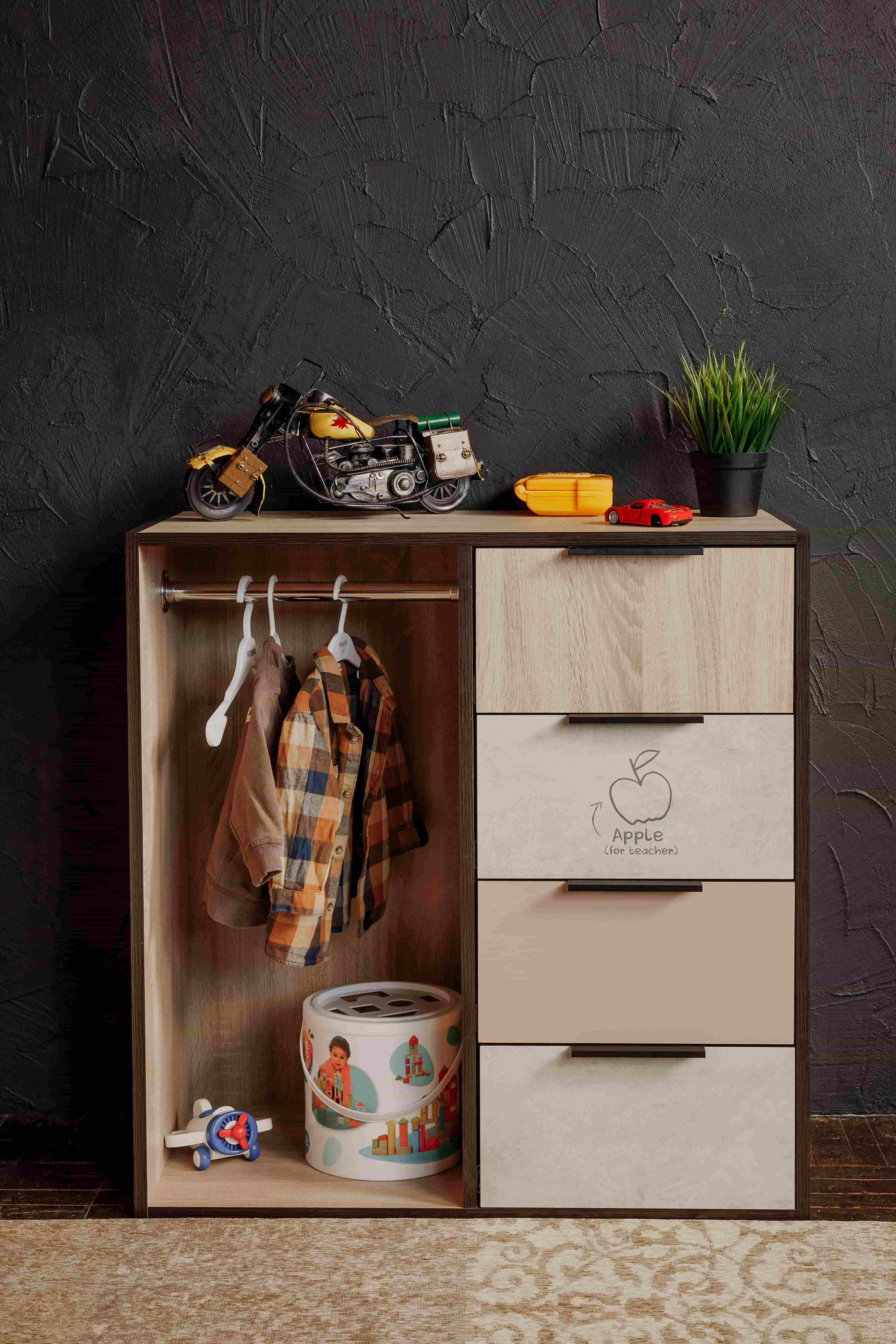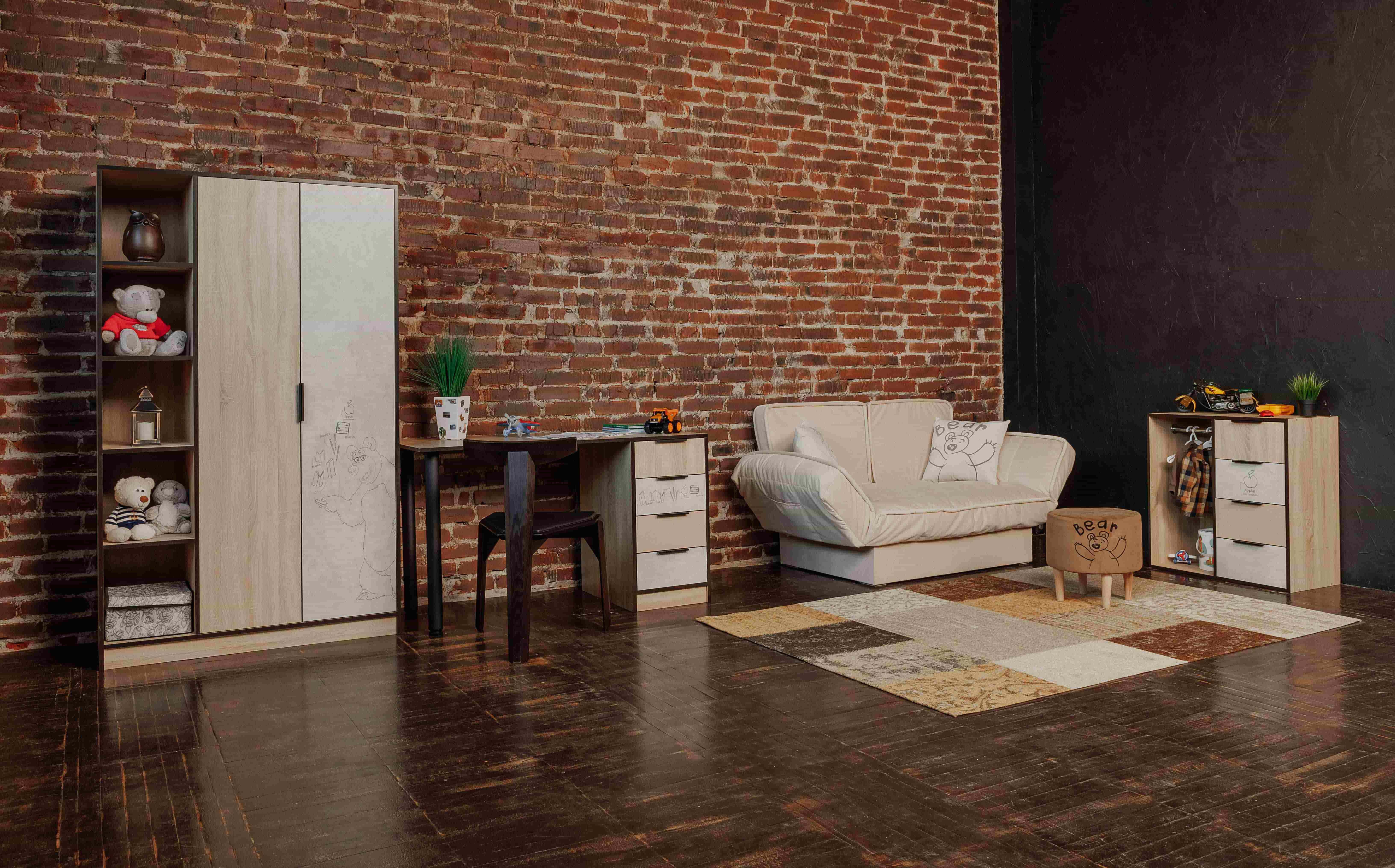 Брали этот комод, шкаф и кровать. Получился очень хороший комплект, много места не занимает, очень много вещей поместилось. Дети очень рады, просто замечательная коллекция.