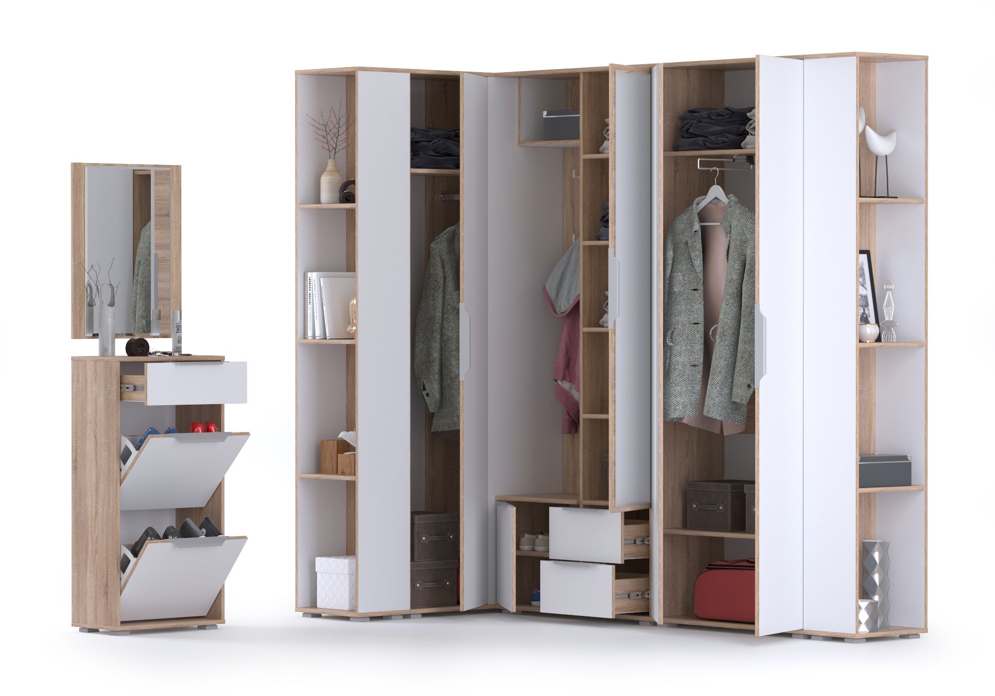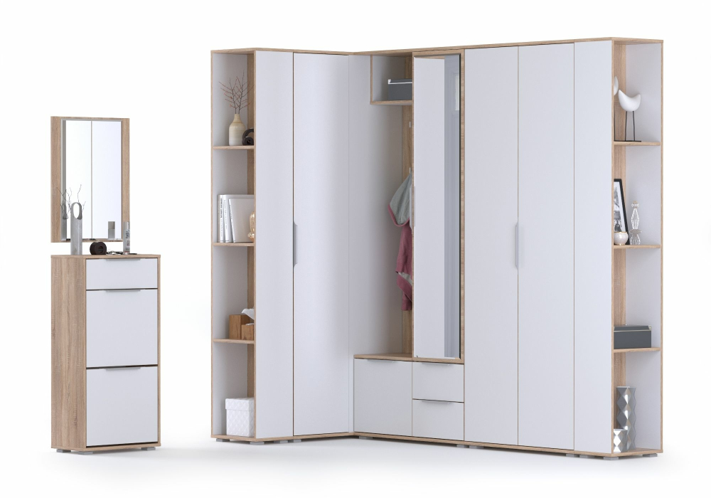 Мебель в прихожую серии Куба № 15 - порядок и украшение большой прихожей или холла! Набор мебель Куба № 15 создаст комфортный, функциональный и безопасный интерьер, украсит уникальной эстетикой белоснежных фасадов. Угловая конструкция прихожей Куба № 15 позволяет, используя труднодоступные места помещения, создать вместительную систему хранения. Набор мебели в прихожую Куба № 15 включает шкаф комбинированный, шкаф угловой, двустворчатый шкаф, два открытых стеллажа, обувницу высокую с ящиком и зеркало навесное. Такая разноплановость элементов набора мебели Куба № 16, позволяет бережно относится к своему гардеробу и содержать дом в порядке. Многофункциональный шкаф Куба 10.14 удобно комбинирует открытую вешалку и одностворчатый шкаф с двумя выдвижными ящиками. Распашная дверь одностворчатого шкафа декорирована зеркалом во всю её длину, внутри шкаф оборудован тремя съёмными полками. Большое зеркало шкафа - непременный элемент прихожей, помогающий Вам выглядеть идеально и освежающий интерьер. Открытая вешалка, с четырьмя крючками для одежды, имеет антресольную полку для головных уборов и распашное отделение для обуви. Оба шкафа набора мебели Куба № 16 оборудованы штангами для вешалок с одеждой - двустворчатый выдвижной, угловой - горизонтальной. Верхнюю одежду можно проветрить и просушить на открытой вешалке, после чего убрать в один из шкафов прихожей - для сохранения формы. Дополнительно в шкафах предусмотрены полки, выделяющие отдельные ниши для вещей, обуви, головных уборов и аксессуаров. Два открытых стеллажа Куба 13.141 с тремя полочками внесут визуальную лёгкость в оформление прихожей, добавит комфорт и стиль. Стильная обувница высокая Куба оборудована выдвижным ящиком для мелочей и двумя нишами для обуви за откидными фасадами. Откидные двери обувницы высокой Куба снабжены механизмом со специальными полками для размещения обуви. Высота обувницы, 102 см., позволит использовании её в качестве удобного подзеркальника для навесного зеркала Куба. Универсальная сборка набора мебели в прихожую Куба № 15 позволит составить максимально эргономичный гарнитур. Дизайнеры прихожей Куба, объединив эстетику и передовую технологию, создали элегантный гарнитур в современной стилистике. Пастель и древесная фактура корпусов прихожей Куба согревают природной теплотой визуальную прохладу белоснежных фасадов мебели. Актуальный тренд - минимальное декорирование мебели позволяет сформировать лаконичные, интересные ансамбли для любых помещений. Незамысловатые формы и абсолютная эргономичность прихожей Куба делают благородную элегантность интерьеров по-домашнему уютной.