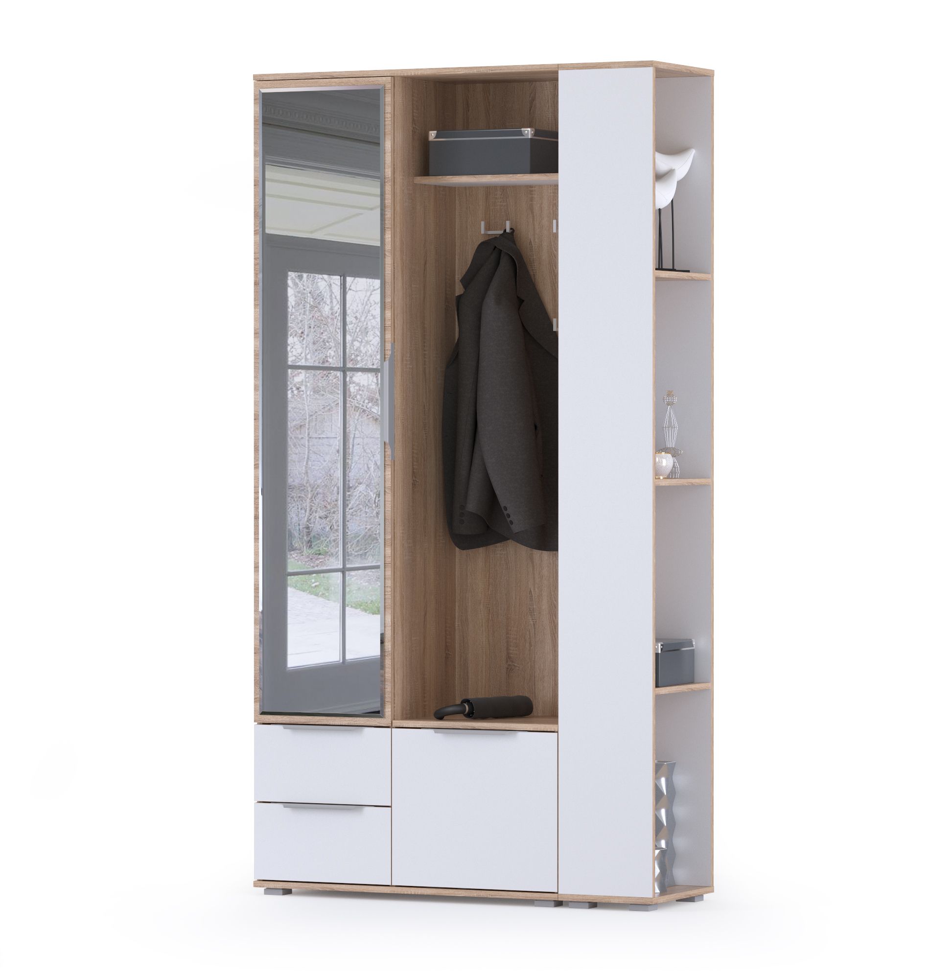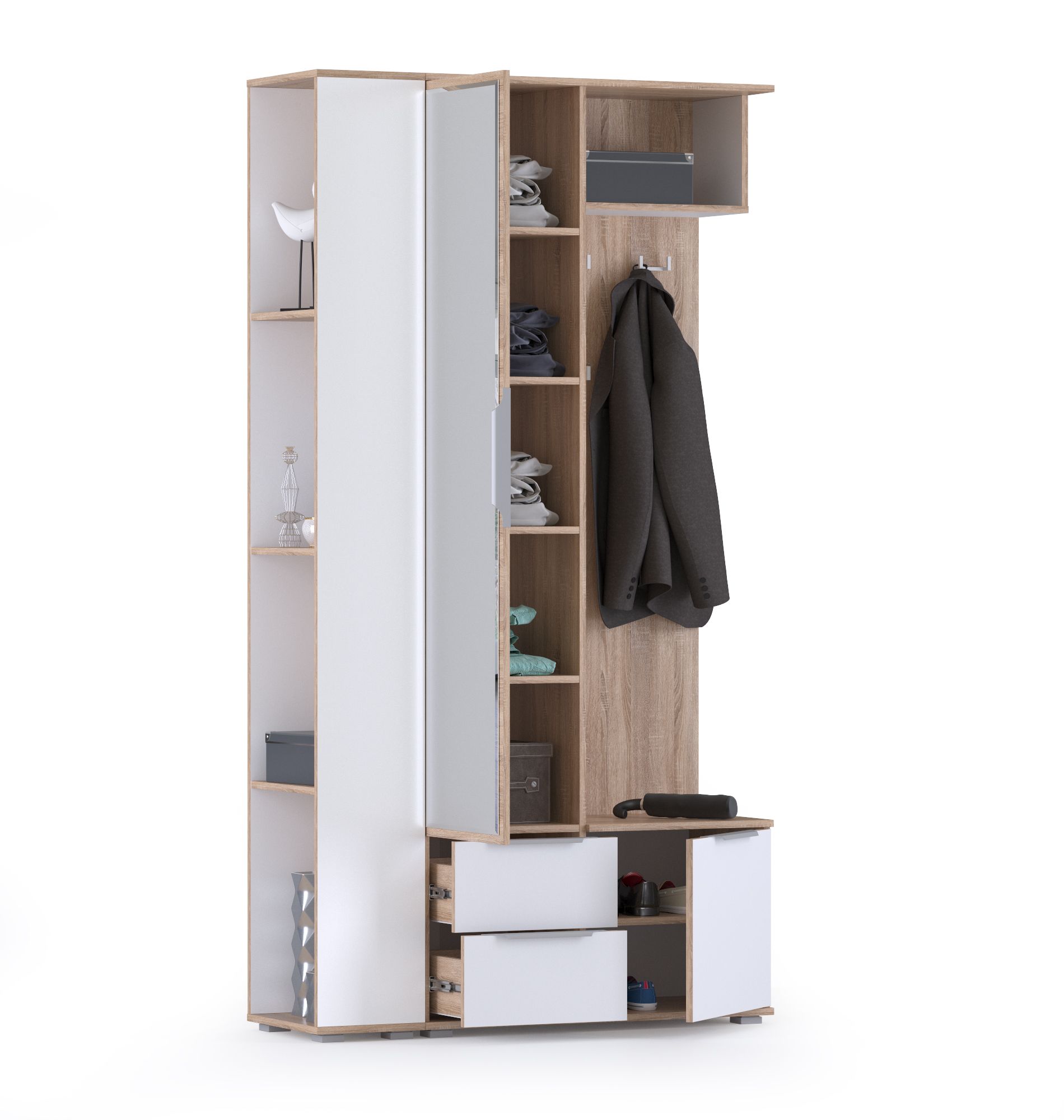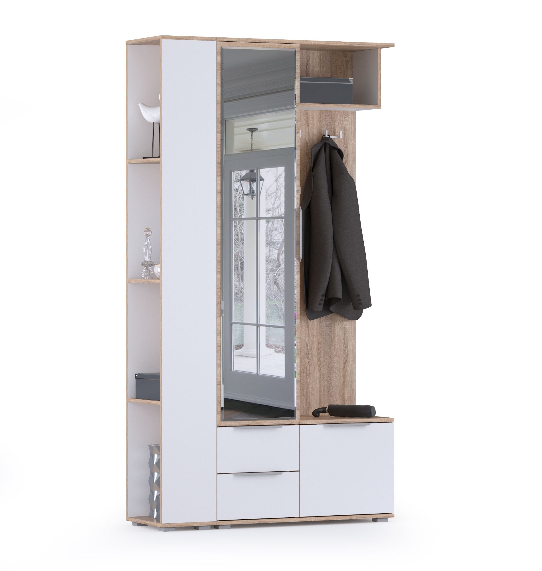 Прихожая Куба № 18 - обладательница всегда ценных достоинств - практичности, удобства и красоты! Данная комплектация гарнитура Куба будет интересна семье с детками для обустройства небольшой прихожей или дачи. Прихожая Куба № 18 способна, буквально на нескольких квадратных метрах, создать комфортный, функциональный и безопасный интерьер. Шкаф комбинированный 10.14 с открытым стеллажом Куба модель 13.141 составляют компактную прихожую классической комплектации. Многофункциональный шкаф Куба 10.14 удобно комбинирует открытую вешалку и одностворчатый шкаф с двумя выдвижными ящиками. Распашная дверь одностворчатого шкафа декорирована зеркалом во всю её длину, внутри шкаф оборудован тремя съёмными полками. Открытая вешалка, с четырьмя крючками для одежды, имеет антресольную полку для головных уборов и распашное отделение для обуви. Компактный, открытый стеллаж Куба 13.141 с тремя полочками внесёт визуальную лёгкость в оформление прихожей, добавит комфорт и стиль. Универсальная сборка набора мебели прихожей Куба № 18 позволит составить максимально эргономичный гарнитур. Дизайнеры прихожей Куба, объединив эстетику и передовую технологию, создали элегантный гарнитур в современной стилистике. Пастель и древесная фактура корпусов прихожей Куба согревают природной теплотой визуальную прохладу белоснежных фасадов мебели. Актуальный тренд - минимальное декорирование мебели позволяет сформировать лаконичные, интересные ансамбли для любых помещений. Незамысловатые формы и абсолютная эргономичность прихожей Куба делают благородную элегантность интерьеров по-домашнему уютной.