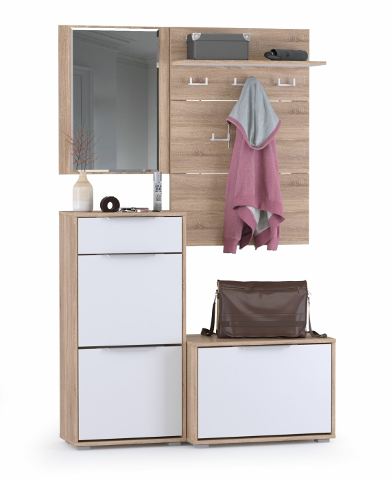 Высокая обувница и обувница с зеркалом и вешалкой для одежды Куба № 7 - оптимальный вариант мини-прихожей. Данный набор мебели Куба будет интересен семье с детками для обустройства небольшой прихожей или дачи. В двух обувницах вполне достаточно места, чтобы хранить отдельно детскую обувь, что особенно удобно при утренних сборах. Высокая обувница Куба 13.114 оборудована двумя нишами для обуви за откидными фасадами, обувница Куба 13.58 - ещё одной! Откидные двери обувниц Куба снабжены механизмом со специальными полками для аккуратного размещения сезонной обуви. Обувница высокая Куба дополнена выдвижным ящиком для мелочей. Крышка обувницы высотой 102 см. послужит подзеркальником. Низкая обувница может быть использована ещё и в качестве подставки для сумок и банкетки для переобувания. Вешалка для верхней одежды Куба Полка 10.122 - разумная традиция хранения сезонной одежды. Открытая вешалка выполнена в виде панели из трёх полос, соединённых вставками, что визуально разгружает изделие. Настенная вешалка оборудована пятью стильными, пластиковыми двухрожковыми крючками для одежды, сумок и зонтиков. Полка, расположенная над крючками вешалки Куба Полка 10.122, предназначена для хранения головных уборов. Зеркало навесное Куба - уникальный элемент прихожих, помогающий Вам всегда выглядеть идеально. Универсальная сборка набора мебели для прихожих Куба позволит составить максимально эргономичный гарнитур. Высокая обувница и обувница с зеркалом и вешалкой для одежды Куба - элементы из набора мебели для прихожих Куба.