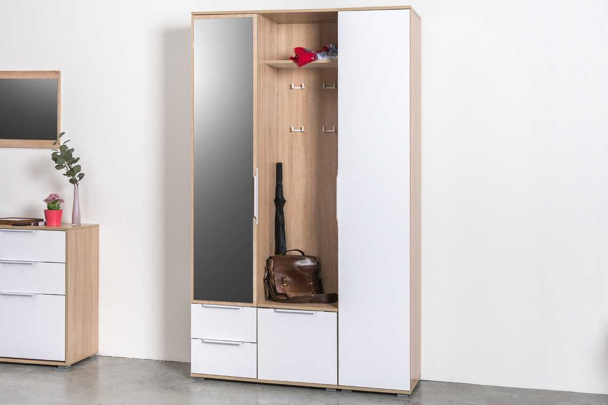 Описание линии мебели для прихожих Куба: Прихожие Куба - обладательницы всегда ценных достоинств - практичности, удобства и красоты! Предлагаем сотворить свой собственный, уникальный мир любимого Дома, прямо начиная с порога, при помощи мебели для прихожих Куба. Дизайнеры прихожих Куба, объединив эстетику и передовую технологию, создали элегантную коллекцию в современной стилистике. Пастель и древесная фактура корпусов прихожих Куба согревают природной теплотой визуальную прохладу белоснежных фасадов мебели. Актуальный тренд - минимальное декорирование мебели позволяет сформировать лаконичные, интересные ансамбли для любых помещений. Коллекцию Куба представляют 11 предметов - навесные полка, вешалка и зеркало, 3 модели обувницы, стеллаж и 4 вида шкафа для одежды. Модули прихожей Куба способны, буквально на нескольких квадратных метрах, создать комфортный, функциональный и безопасный интерьер. Для больших холлов и приёмных офисов из набора для прихожих Куба можно собрать бесконечное количество оригинальных композиций. Незамысловатые формы и абсолютная эргономичность прихожих Куба делают благородную элегантность интерьеров по-домашнему уютной. Корпуса и фасады мебели Куба выполнены из ламинированной ДСП 16 мм. Опоры - серый пластик, лицевая фурнитура - металл, цвет белый. Современная фурнитура, использованная в производстве прихожих Куба, отличается высокой надёжностью и долговечностью. Распашные двери модулей прихожих Куба на четырёхшарнирных петлях, выдвижные ящики на шариковых направляющих полного выдвижения. Мебель прихожих Куба поставляется в разобранном виде, с комплектом фурнитуры, упакованная в 4-х слойный гофрокартон. Соответствие ГОСТам и требованиям Таможенного Союза прихожих Куба и материалов их производства подтверждено сертификатами.