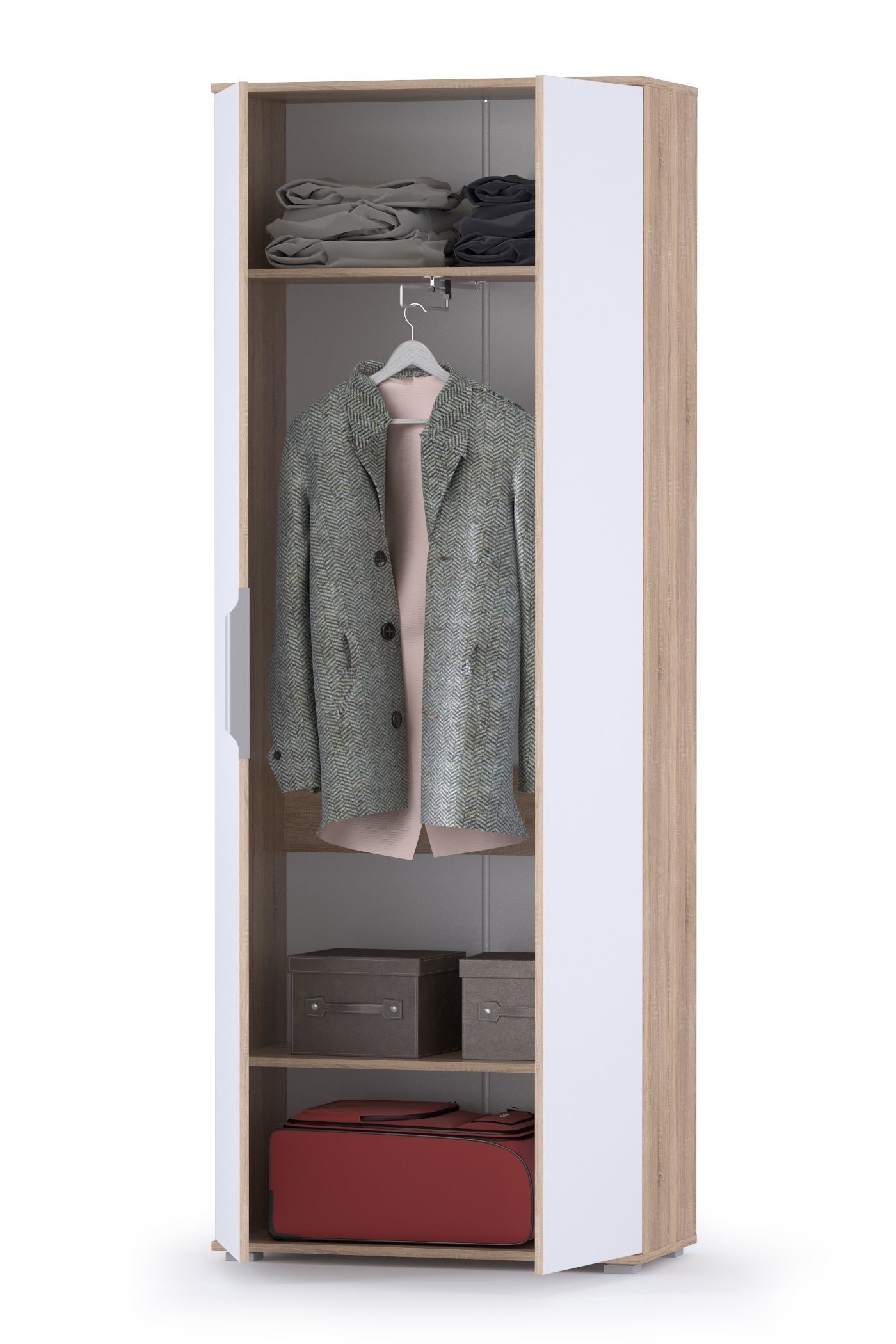 Шкаф для одежды Куба 13.136 - двустворчатый, распашной шкаф, удобный и нарядный. Две полки разделяют шкаф на три отсека - центральный с выдвижной штангой для одежды, антресольный для головных уборов, нижний для обуви. Шкаф для одежды Куба 13.136 - элемент из набора мебели для прихожих Куба.