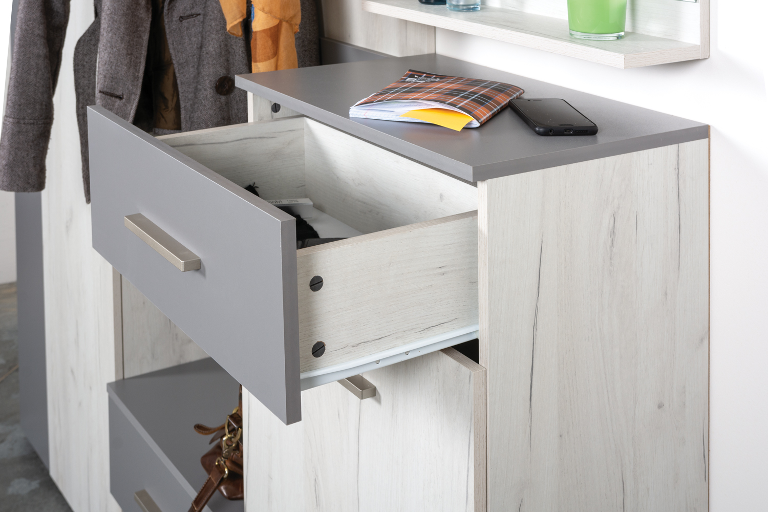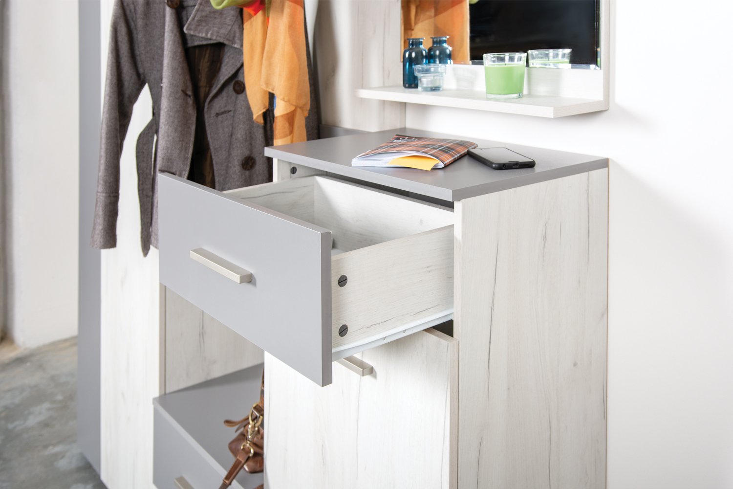 Описание линии мебели для прихожих Юнона: Прихожие Юнона - стильная и практичная мебель для современной прихожей. Мебель Юнона отличает лаконичный дизайн в сочетании с максимальной функциональностью. Прямые линии, сочетание светлых (дуб белый) и тёмных тонов (серый шифер), зеркала, правильные аксессуары - всё подчёркивает особенный характер мебели Юнона. Вашему вниманию представлены комод, шкаф двустворчатый и шкаф навесной, зеркало, вешалка и тумба для обуви. При помощи этих модулей Вы составите оптимальную обстановку в прихожей дома или офиса. Прихожая Юнона удобна в использовании - функциональное наполнение каждого элемента продумано до мелочей. Гарантией долгой службы будут высокие критерии качества производства, материалов и фурнитуры мебели Юнона. Выполнена прихожая Юнона по строгим стандартам европейской мебели, процесс производства автоматизирован и компьютеризирован.