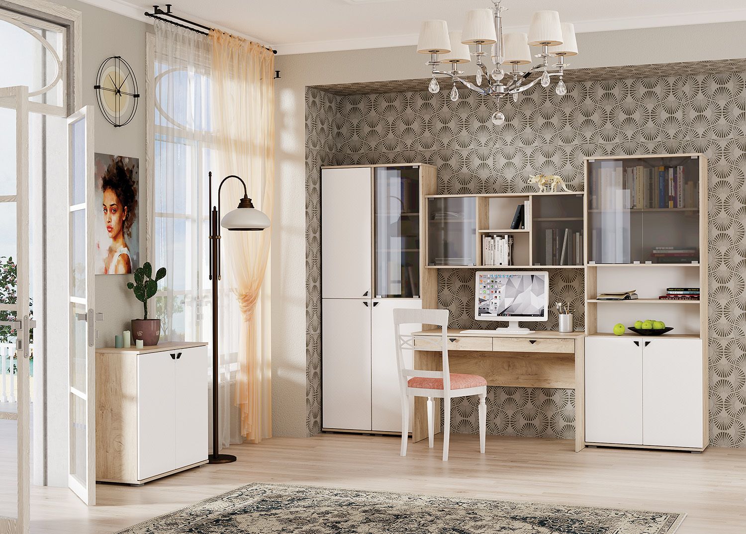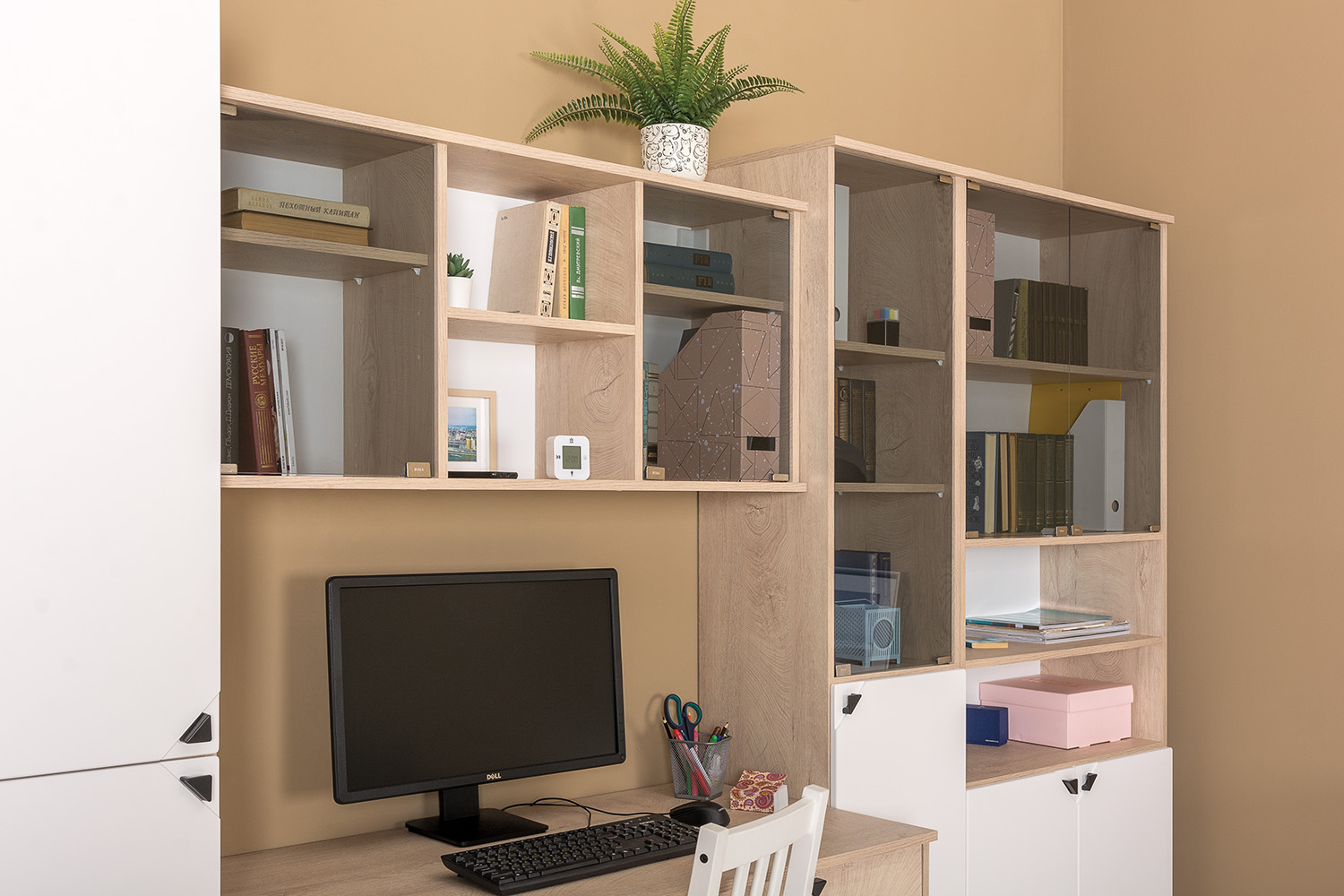 Описание коллекции мебели для домашнего офиса Бостон: Домашний офис Бостон - коллекция удобной и функциональной мебели для современного рабочего места. Серию Бостон составляют 7 практичных модулей, компонуя которые, можно составить комплект мебели в соответствии с Вашим желанием и выделенным бюджетом. Компьютерный стол, открытая и закрытая полочки, три шкафа и комод помогут реализовать Ваш проект, и составят эргономичную обстановку домашнего офиса. Модули практичны, имеют универсальную сборку, что расширяет варианты компоновок и расположения в интерьере кабинетов, составляя максимально комфортную рабочую атмосферу. Стильный дизайн мебели Бостон подчёркнут сочетанием красивого древесного цвета корпуса, белых фасадов, чёрных матовых металлических ручек, расположенных в специальных угловых углублениях на дверках и онированного стекла витрин, открывающихся при помощи механизма push (нажмите на уголок и дверка откроется). Современный процесс производства мебели при постоянном контроле качества результатов и материалов гарантируют длительный срок службы и соответствие высоким стандартам. Корпус мебели Бостон изготовлен из ламинированной ДСП 16 мм., сертифицированной к изготовлению детской мебели. Глухие дверки шкафов и комода выполнены из прочной и экологичной МДФ плиты, ламинированной плёнкой ПВХ с тактильно приятным покрытием софт-тач. Торцы деталей мебели защищены кантом ПВХ 0,4 мм. и 2 мм, украшающим изделия, защищающим от механических повреждений и продлевающим срок службы. В сборке мебели используется фурнитура высокого качества проверенных временем поставщиков. Глухие распашные двери закреплены на четырёхшарнирных петлях, дверки-витрины из тонированного стекла - на осевых петлях, выкатные ящики - на металлических шариковых направляющих полного выдвижения. Поставка мебели производится в разобранном виде, в прочной упаковке, защищающей Вашу покупку при транспортировке и хранении. К каждому изделию прилагается гарантийный талон и подробная инструкция по сборке и эксплуатации в комплекте с необходимой для сборки фурнитурой.