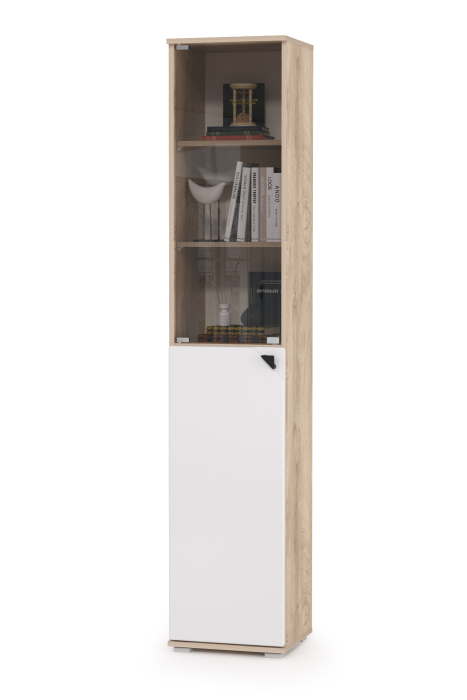 Шкаф-пенал Бостон 13.155 - узкий, высокий шкаф увеличит комфорт и эргономичность Вашего рабочего места. Расположив шкаф возле компьютерного стола, Вы сможете разместить необходимые для работы и учебы материалы на удобном, близком расстоянии. Несколько таких модулей по функциональности смогут с успехом заменить широкий вместительный шкаф. Конструктивно, модель представляет собой шкаф-пенал с двумя закрытыми распашными дверками отделениями с парой полочек в каждом. Верхняя дверка выполнена из тонированного стекла и имеет механизм открытия push (нажмите на уголок и дверка откроется). Двери шкафа универсальны и могут открываться в любую сторону, что нужно определить при первой сборке модуля. Шкаф Бостон 13.155 - элемент из набора мебели для домашнего офиса Бостон.