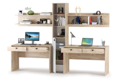 Столы Бостон № 06 с полками и стеллажом со стеклом - простой, универсальный комплект мебели составит основу двух комфортных рабочих зон для пары сотрудников или двух любимых деток. Каждое рабочее место состоит из компьютерного стола и настенной открытой полочки. Между рабочими зонами расположен высокий узкий стеллаж со стеклом. Классический дизайн, элегантный цвет набора мебели позволит с успехом интегрировать его в обстановку современного кабинета. Все элементы мебели имеют универсальную сборку и могут быть расположены друг относительно друга в удобном Вам порядке. Компьютерный стол имеет вместительную столешницу, на которой достаточно места для ноутбука или монитора стационарного компьютера. Под столешницей на шариковых металлических направляющих закреплены два выдвижных ящика для документов и канцтоваров. Двойная настенная полочка увеличит эргономичность рабочего места. Необходимые для работы и учебы материалы на удобном, близком расстоянии. Полка предполагает крепление к стене, комплект крепёжной фурнитуры входит в поставку. Максимальная нагрузка на полку составляет 3 кг. Узкий, высокий шкаф-стеллаж увеличит комфорт и эргономичность Вашего рабочего места. Конструктивно, Верхняя дверка выполнена из тонированного стекла и имеет механизм открытия push (нажмите на уголок и дверка откроется). Двери шкафа универсальны и могут открываться в любую сторону, что нужно определить при первой сборке модуля. Столы Бостон с полками и стеллажом со стеклом - элементы набора мебели для домашнего офиса Бостон.