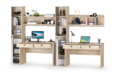 Домашний офис для двух человек Бостон № 10 - универсальный комплект мебели составит основу двух комфортных рабочих зон для пары сотрудников или деток. Классический дизайн, элегантный цвет набора мебели позволит с успехом интегрировать его в обстановку современного кабинета. Каждое рабочее место состоит из компьютерного стола, открытой настенной полочки и шкафа-пенала со стеклом. Все элементы мебели имеют универсальную сборку и могут быть расположены друг относительно друга в удобном Вам порядке. Компьютерный стол имеет вместительную столешницу, на которой достаточно места для ноутбука или монитора стационарного компьютера. Под столешницей на шариковых металлических направляющих закреплены два выдвижных ящика для документов и канцтоваров. Двойная настенная полочка увеличит эргономичность рабочего места. Необходимые для работы и учебы материалы на удобном, близком расстоянии. Модуль предполагает крепление к стене, комплект крепёжной фурнитуры входит в поставку. Максимальная нагрузка на полку составляет 3 кг. Узкий, высокий шкаф-стеллаж увеличит комфорт и эргономичность Вашего рабочего места. Конструктивно, Верхняя дверка выполнена из тонированного стекла и имеет механизм открытия push (нажмите на уголок и дверка откроется). Двери шкафа универсальны и могут открываться в любую сторону, что нужно определить при первой сборке модуля. Домашний офис для двух человек Бостон № 10 состоит из элементов набора мебели для домашнего офиса Бостон.