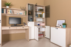 Описание коллекции мебели для домашнего офиса Бостон: Домашний офис Бостон - коллекция удобной и функциональной мебели для современного рабочего места. Серию Бостон составляют 7 практичных модулей, компонуя которые, можно составить комплект мебели в соответствии с Вашим желанием и выделенным бюджетом. Компьютерный стол, открытая и закрытая полочки, три шкафа и комод помогут реализовать Ваш проект, и составят эргономичную обстановку домашнего офиса. Модули практичны, имеют универсальную сборку, что расширяет варианты компоновок и расположения в интерьере кабинетов, составляя максимально комфортную рабочую атмосферу. Стильный дизайн мебели Бостон подчёркнут сочетанием красивого древесного цвета корпуса, белых фасадов, чёрных матовых металлических ручек, расположенных в специальных угловых углублениях на дверках и тонированного стекла витрин, открывающихся при помощи механизма push (нажмите на уголок и дверка откроется). Современный процесс производства мебели при постоянном контроле качества результатов и материалов гарантируют длительный срок службы и соответствие высоким стандартам. Корпус мебели Бостон изготовлен из ламинированной ДСП 16 мм., сертифицированной к изготовлению детской мебели. Глухие дверки шкафов и комода выполнены из прочной и экологичной МДФ плиты, ламинированной плёнкой ПВХ с тактильно приятным покрытием софт-тач. Торцы деталей мебели защищены кантом ПВХ 0,4 мм. и 2 мм, украшающим изделия, защищающим от механических повреждений и продлевающим срок службы. В сборке мебели используется фурнитура высокого качества проверенных временем поставщиков. Глухие распашные двери закреплены на четырёхшарнирных петлях, дверки-витрины из тонированного стекла - на осевых петлях, выкатные ящики - на металлических шариковых направляющих полного выдвижения. Поставка мебели производится в разобранном виде, в прочной упаковке, защищающей Вашу покупку при транспортировке и хранении. К каждому изделию прилагается гарантийный талон и подробная инструкция по сборке и эксплуатации в комплекте с необходимой для сборки фурнитурой.