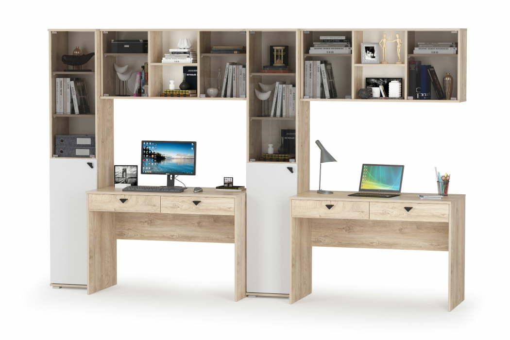Набор мебели для домашнего офиса Бостон № 21 - универсальный комплект мебели составит основу двух комфортных рабочих зон для пары сотрудников или деток. Классический дизайн, элегантный цвет набора мебели позволит с успехом интегрировать его в обстановку современного кабинета. Каждое рабочее место состоит из компьютерного стола, навесного шкафчика и шкафа-пенала со стеклом. Все элементы мебели имеют универсальную сборку и могут быть расположены друг относительно друга в удобном Вам порядке. Компьютерный стол имеет вместительную столешницу, на которой достаточно места для ноутбука или монитора стационарного компьютера. Под столешницей на шариковых металлических направляющих закреплены два выдвижных ящика для документов и канцтоваров. Компактный навесной шкафчик увеличит комфорт и эргономичность Вашего рабочего места. Необходимые для работы и учебы материалы на удобном, близком расстоянии. Конструктивно, шкаф представляет собой три ниши с одной полочкой каждая. Центральная ниша открытая, боковые закрыты дверками из тонированного стекла. Модуль предполагает крепление к стене, комплект крепёжной фурнитуры входит в поставку. Максимальная нагрузка на полку составляет 3 кг. Узкий, высокий шкаф-стеллаж увеличит комфорт и эргономичность Вашего рабочего места. Конструктивно, Верхняя дверка выполнена из тонированного стекла и имеет механизм открытия push (нажмите на уголок и дверка откроется). Двери шкафа универсальны и могут открываться в любую сторону, что нужно определить при первой сборке модуля. Набор мебели для домашнего офиса Бостон № 21 состоит из элементов набора мебели для домашнего офиса Бостон.