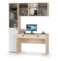Уголок школьника Бостон № 23 - универсальный комплект мебели составит основу комфортного рабочего места в кабинете дома или офиса. В данной комплектации набор мебели состоит из компьютерного стола, навесного шкафа и шкафа-стеллажа со стеклом. Все элементы мебели имеют универсальную сборку и могут быть расположены друг относительно друга в удобном Вам порядке. Классический дизайн, элегантный цвет набора мебели позволит с успехом интегрировать его в обстановку современного кабинета. Компьютерный стол имеет вместительную столешницу, на которой достаточно места для ноутбука или монитора стационарного компьютера. Под столешницей на шариковых металлических направляющих закреплены два выдвижных ящика для документов и канцтоваров. Компактный навесной шкафчик увеличит комфорт и эргономичность Вашего рабочего места. На полочках шкафчика Вы сможете разместить необходимые для работы и учебы материалы на удобном, близком расстоянии. Центральная ниша шкафа открытая, боковые закрыты дверками из тонированного стекла, открывающихся при помощи механизма push (нажмите на уголок и дверка откроется). Шкаф предполагает крепление к стене, комплект крепёжной фурнитуры входит в поставку. Максимальная нагрузка на каждую полку шкафа составляет 3 кг. Узкий, высокий шкаф-стеллаж завершает композицию. Конструктивно, аждом. Верхняя дверка выполнена из тонированного стекла и имеет механизм открытия push (нажмите на уголок и дверка откроется). Двери шкафа универсальны и могут открываться в любую сторону, что нужно определить при первой сборке модуля. Уголок школьника Бостон № 23 состоит из элементов набора мебели для домашнего офиса Бостон.