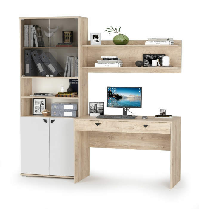 Описание коллекции мебели для домашнего офиса Бостон: Домашний офис Бостон - коллекция удобной и функциональной мебели для современного рабочего места. Серию Бостон составляют 7 практичных модулей, компонуя которые, можно составить комплект мебели в соответствии с Вашим желанием и выделенным бюджетом. Компьютерный стол, открытая и закрытая полочки, три шкафа и комод помогут реализовать Ваш проект, и составят эргономичную обстановку домашнего офиса. Модули практичны, имеют универсальную сборку, что расширяет варианты компоновок и расположения в интерьере кабинетов, составляя максимально комфортную рабочую атмосферу. Стильный дизайн мебели Бостон подчёркнут сочетанием красивого древесного цвета корпуса, белых фасадов, чёрных матовых металлических ручек, расположенных в специальных угловых углублениях на дверках и тонированного стекла витрин, открывающихся при помощи механизма push (нажмите на уголок и дверка откроется). Современный процесс производства мебели при постоянном контроле качества результатов и материалов гарантируют длительный срок службы и соответствие высоким стандартам. Корпус мебели Бостон изготовлен из ламинированной ДСП 16 мм., сертифицированной к изготовлению детской мебели. Глухие дверки шкафов и комода выполнены из прочной и экологичной МДФ плиты, ламинированной плёнкой ПВХ с тактильно приятным покрытием софт-тач. Торцы деталей мебели защищены кантом ПВХ 0,4 мм. и 2 мм, украшающим изделия, защищающим от механических повреждений и продлевающим срок службы. В сборке мебели используется фурнитура высокого качества проверенных временем поставщиков. Глухие распашные двери закреплены на четырёхшарнирных петлях, дверки-витрины из тонированного стекла - на осевых петлях, выкатные ящики - на металлических шариковых направляющих полного выдвижения. Поставка мебели производится в разобранном виде, в прочной упаковке, защищающей Вашу покупку при транспортировке и хранении. К каждому изделию прилагается гарантийный талон и подробная инструкция по сборке и эксплуатации в комплекте с необходимой для сборки фурнитурой.