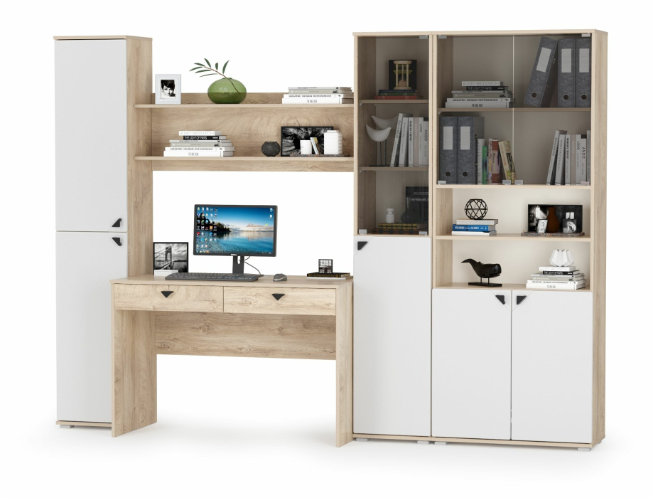 Описание коллекции мебели для домашнего офиса Бостон: Домашний офис Бостон - коллекция удобной и функциональной мебели для современного рабочего места. Серию Бостон составляют 7 практичных модулей, компонуя которые, можно составить комплект мебели в соответствии с Вашим желанием и выделенным бюджетом. Компьютерный стол, открытая и закрытая полочки, три шкафа и комод помогут реализовать Ваш проект, и составят эргономичную обстановку домашнего офиса. Модули практичны, имеют универсальную сборку, что расширяет варианты компоновок и расположения в интерьере кабинетов, составляя максимально комфортную рабочую атмосферу. Стильный дизайн мебели Бостон подчёркнут сочетанием красивого древесного цвета корпуса, белых фасадов, чёрных матовых металлических ручек, расположенных в специальных угловых углублениях на дверках и тонированного стекла витрин, открывающихся при помощи механизма push (нажмите на уголок и дверка откроется). Современный процесс производства мебели при постоянном контроле качества результатов и материалов гарантируют длительный срок службы и соответствие высоким стандартам. Корпус мебели Бостон изготовлен из ламинированной ДСП 16 мм., сертифицированной к изготовлению детской мебели. Глухие дверки шкафов и комода выполнены из прочной и экологичной МДФ плиты, ламинированной плёнкой ПВХ с тактильно приятным покрытием софт-тач. Торцы деталей мебели защищены кантом ПВХ 0,4 мм. и 2 мм, украшающим изделия, защищающим от механических повреждений и продлевающим срок службы. В сборке мебели используется фурнитура высокого качества проверенных временем поставщиков. Глухие распашные двери закреплены на четырёхшарнирных петлях, дверки-витрины из тонированного стекла - на осевых петлях, выкатные ящики - на металлических шариковых направляющих полного выдвижения. Поставка мебели производится в разобранном виде, в прочной упаковке, защищающей Вашу покупку при транспортировке и хранении. К каждому изделию прилагается гарантийный талон и подробная инструкция по сборке и эксплуатации в комплекте с необходимой для сборки фурнитурой.