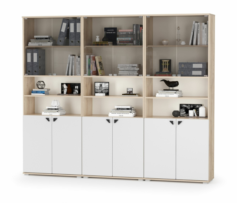 Набор из трёх шкафов Бостон № 51 - красивый набор мебели, состоящий из трёх одинаковых шкафов, поможет на компактной площади организовать вместительную систему хранения. Конструктивно, каждый отдельный шкаф располагает тремя нишами с одной полкой в каждой. Верхняя ниша закрыта распашными дверками из тонированного стекла с механизм открытия push (нажмите на уголок и дверка откроется). За прозрачными дверками можно разместить любимые собрания сочинений или тома, составляющие особую гордость обладателя библиотеки. Спортивные награды или фарфор любимой бабушки, личные любимые предметы декора, бар, буфет или коллекция антикварных раритетов - для всего в витринах шкафов найдется место. Нижняя ниша шкафа закрыта парой глухих распашных дверок, а средняя ниша - открытая. Вместительность и функциональность этого шкафа приятно удивит даже опытных пользователей офисной мебели. А комплект из трех шкафов побьёт все рекорды вместительности на компактной площади. Набор из трёх шкафов Бостон № 519 состоит из элементов набора мебели для домашнего офиса Бостон.