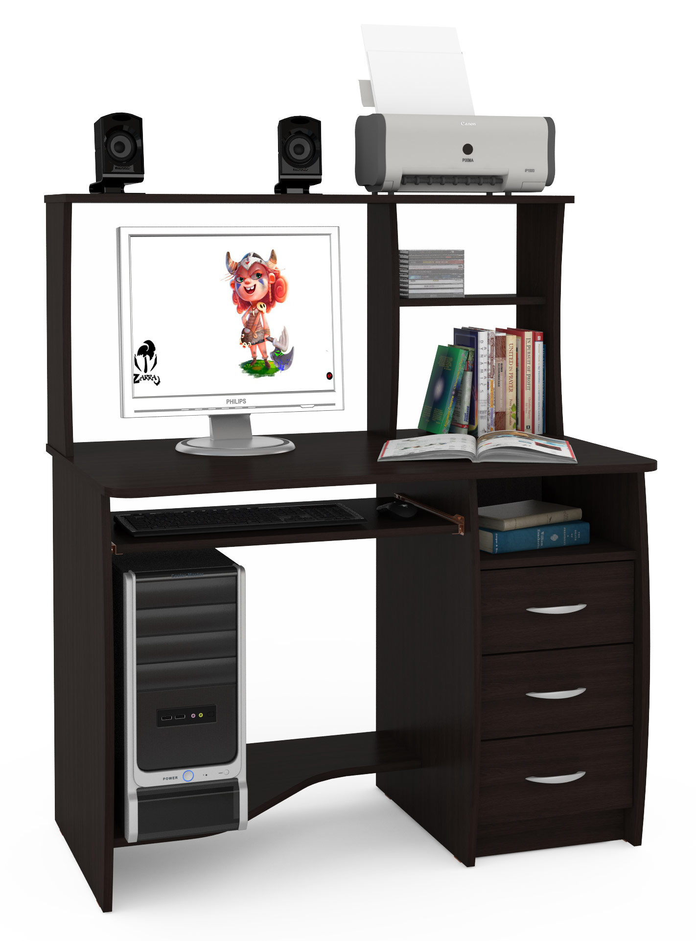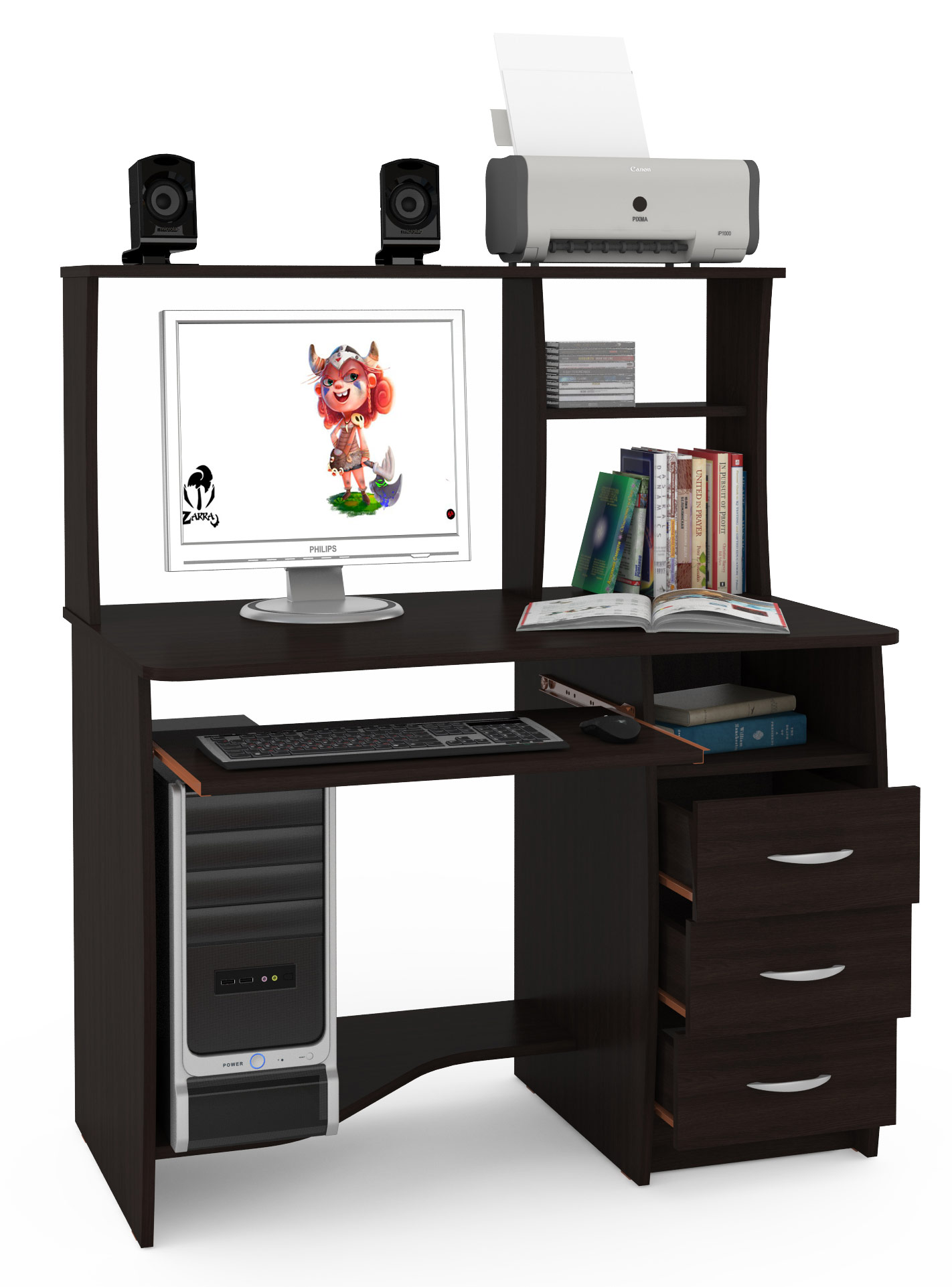 Компьютерный стол Комфорт 4 СК - компактный компьютерный стол составит основу комфортного рабочего места. Ученик, студент, менеджер и научный работник, дома и в офисе будут одинаково довольны своим удобным столом. Стол оборудован широкой столешницей с надстройкой, нишей под системный блок, тумбой и выкатной панелью для клавиатуры и мышки. Широкая и глубокая столешница удобна для работы. На ней достаточно места для деловых и рабочих бумаг, учебников и канцтоваров. Большая надстройка на столешнице состоит из нескольких полочек, составляющих вместительную нишу под монитор, отделение для папок, книг и документов. Под столешницей слева разместилась широкая ниша для системного блока, справа - тумба с тремя выдвижными ящиками и открытой полочкой. В центральной части под столешницей расположена выкатная панель для клавиатуры и мышки. Все элементы стола гармонично дополняют друг друга, составляя очень функциональный стол при компактных размерах. Компьютерный стол Комфорт 4 СК - элемент из линии мебели Компьютерные столы Комфорт.