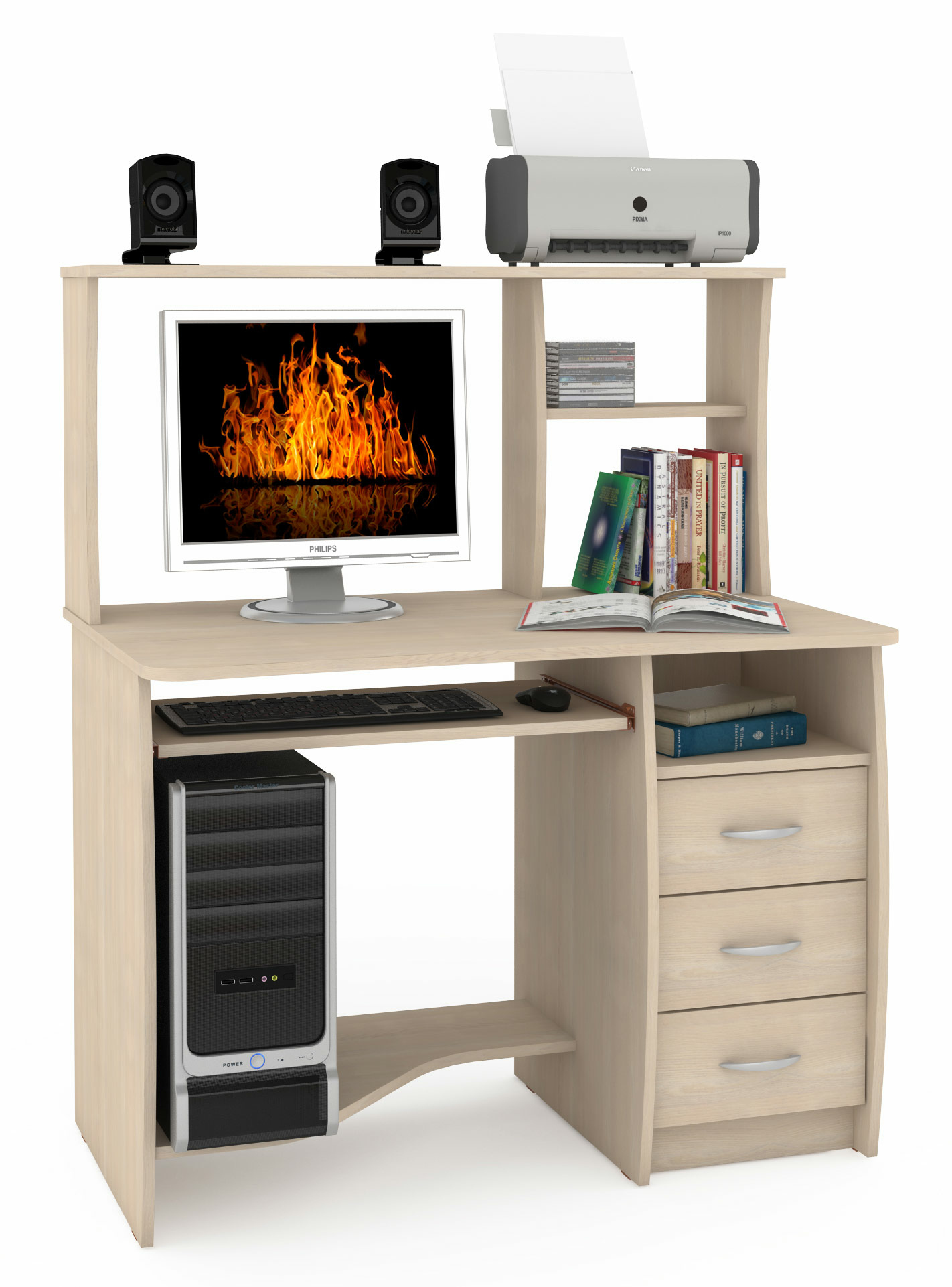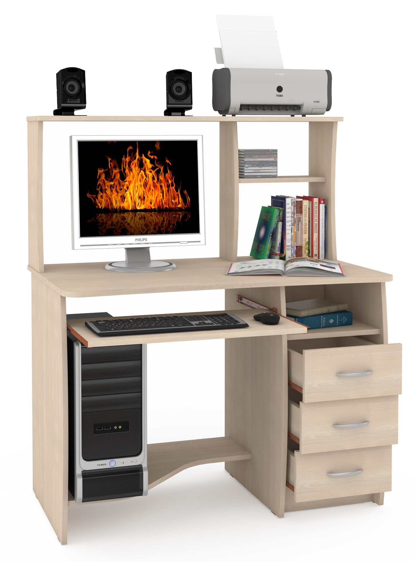 Компьютерный стол Комфорт 4 СК - компактный компьютерный стол составит основу комфортного рабочего места. Ученик, студент, менеджер и научный работник, дома и в офисе будут одинаково довольны своим удобным столом. Стол оборудован широкой столешницей с надстройкой, нишей под системный блок, тумбой и выкатной панелью для клавиатуры и мышки. Широкая и глубокая столешница удобна для работы. На ней достаточно места для деловых и рабочих бумаг, учебников и канцтоваров. Большая надстройка на столешнице состоит из нескольких полочек, составляющих вместительную нишу под монитор, отделение для папок, книг и документов. Под столешницей слева разместилась широкая ниша для системного блока, справа - тумба с тремя выдвижными ящиками и открытой полочкой. В центральной части под столешницей расположена выкатная панель для клавиатуры и мышки. Все элементы стола гармонично дополняют друг друга, составляя очень функциональный стол при компактных размерах. Компьютерный стол Комфорт 4 СК - элемент из линии мебели Компьютерные столы Комфорт.