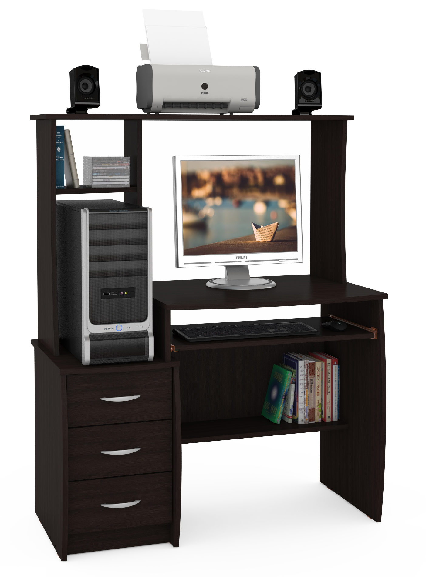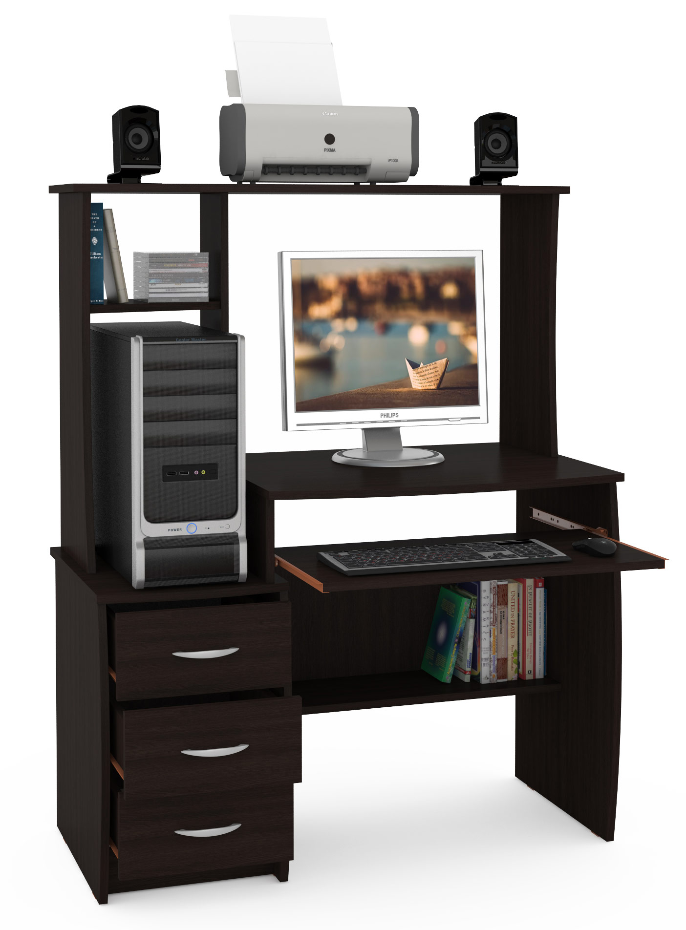 Компьютерный стол Комфорт 5 СК - компактный компьютерный стол составит основу комфортного рабочего места. Ученик, студент, менеджер и научный работник, дома и в офисе будут одинаково довольны своим удобным столом. Стол оборудован широкой столешницей с надстройкой, нишей под системный блок, тумбой и выкатной панелью для клавиатуры и мышки. Глубокая столешница удобна для работы. Слева у стола - тумбочка с тремя выдвижными ящиками. Надстройка стола расположена над столешницей и тумбой, состоит из нескольких полочек, составляющих нишу под монитор и нишу под системный блок. Все элементы стола гармонично дополняют друг друга, составляя очень функциональный стол при компактных размерах. Компьютерный стол Комфорт 5 СК - элемент из линии мебели Компьютерные столы Комфорт.