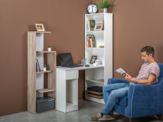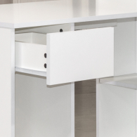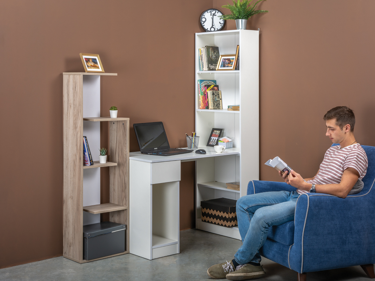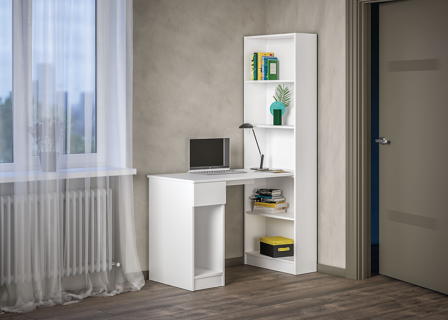 Данная модель представляет собой сочетание удобного однотумбового стола и открытого стеллажа. Такой тандем составляет удобное рабочее место, занимая минимум места, предоставляет максимум функционального наполнения. Стол имеет большую столешницу на которой можно разместить и рабочие документы, и учебные принадлежности. С одной стороны столешница закреплена на тумбе, с другой - на полочке открытого стеллажа. Тумба стола имеет выдвижной ящик и открытую нишу для системного блока стационарного компьютера. Если же, у Вас в пользовании ноутбук, ниша пригодится для размещения портфеля, сумочки или рюкзака. Стеллаж в данной конструкции значительно увеличивает комфорт рабочего места. На четырёх полочках стеллажа можно разместить все, что необходимо для результативной работы или учёбы. Папки с документами, журналы, учебники и книги, мелкая офисная техника, предметы декора или игрушки. Завершив работу, положите на полочку сложенный ноутбук и освободите столешницу для игры с ребенком или собирания пазлов. Стол удовлетворит любые Ваши запросы и приятно удивит как функциональностью, так и демократичной ценой. Выполнен стол из ламинированной ДСП 16 мм., края деталей защищены кромкой ПВХ 0,4 мм. и 2 мм. Процесс производства компьютеризирован и проходит постоянный контроль качества, что гарантирует высокую точность в изготовлении мебели. Поставка стола производится в разобранном виде, надёжно запакованным, к изделию прилагается инструкция по сборке и необходимая для сборки урнитура. Обращаем Ваше внимание, что для надёжной фиксации стола, необходимо крепление стеллажа к стене.