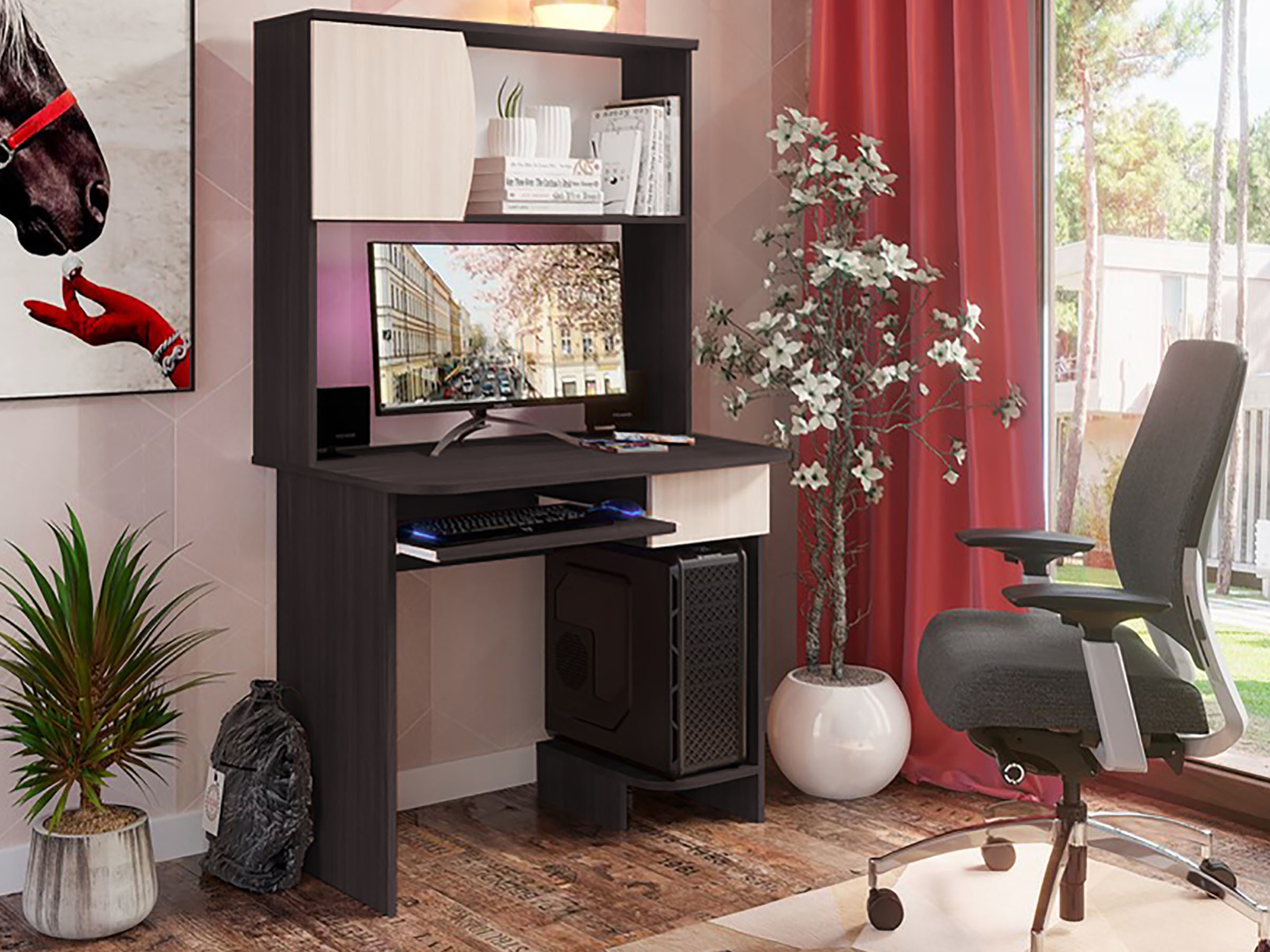Стол компьютерный №2 позволит организовать удобное и компактное рабочее пространство. В комплектацию стола входят надстройка с открытой и закрытой секциями, выдижной ящик, выкатная полка, а так же подставка под системный блок. Направляющие: роликовые.