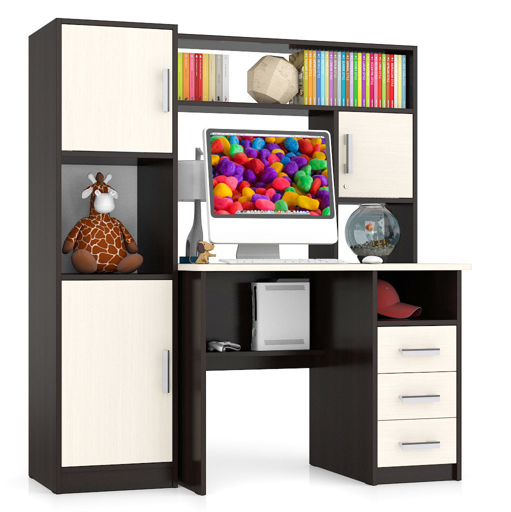 Стол СК-9 выполнен в классическом компактном варианте - удобная столешница, надстройка с нишей для монитора и тумба с ящиками. Вместительная столешница разместит ноутбук или монитор с клавиатурой, оставив свободное место для документов и учебных пособий. Под столешницей оборудованы две открытые ниши, которые сохранят «под рукой» все первоочередное и достаточно места для установки системного блока. Стол не имеет универсальной сборки - справа у стола расположена тумба с тремя вместительными выдвижными ящиками, для хранения деловых бумаг и канцтоваров. Надстройка стола ограждает зону для установки монитора, защищая его от внешних повреждений. Вместительная ниша под монитор, размером 65х70х57 см, позволяет разместить монитор диагональю до 27 дюймов. Верхняя полка и боковые закрытая и открытая ниши надстройки отлично разместятся справочники, учебники, папки с документами и аппаратуру.