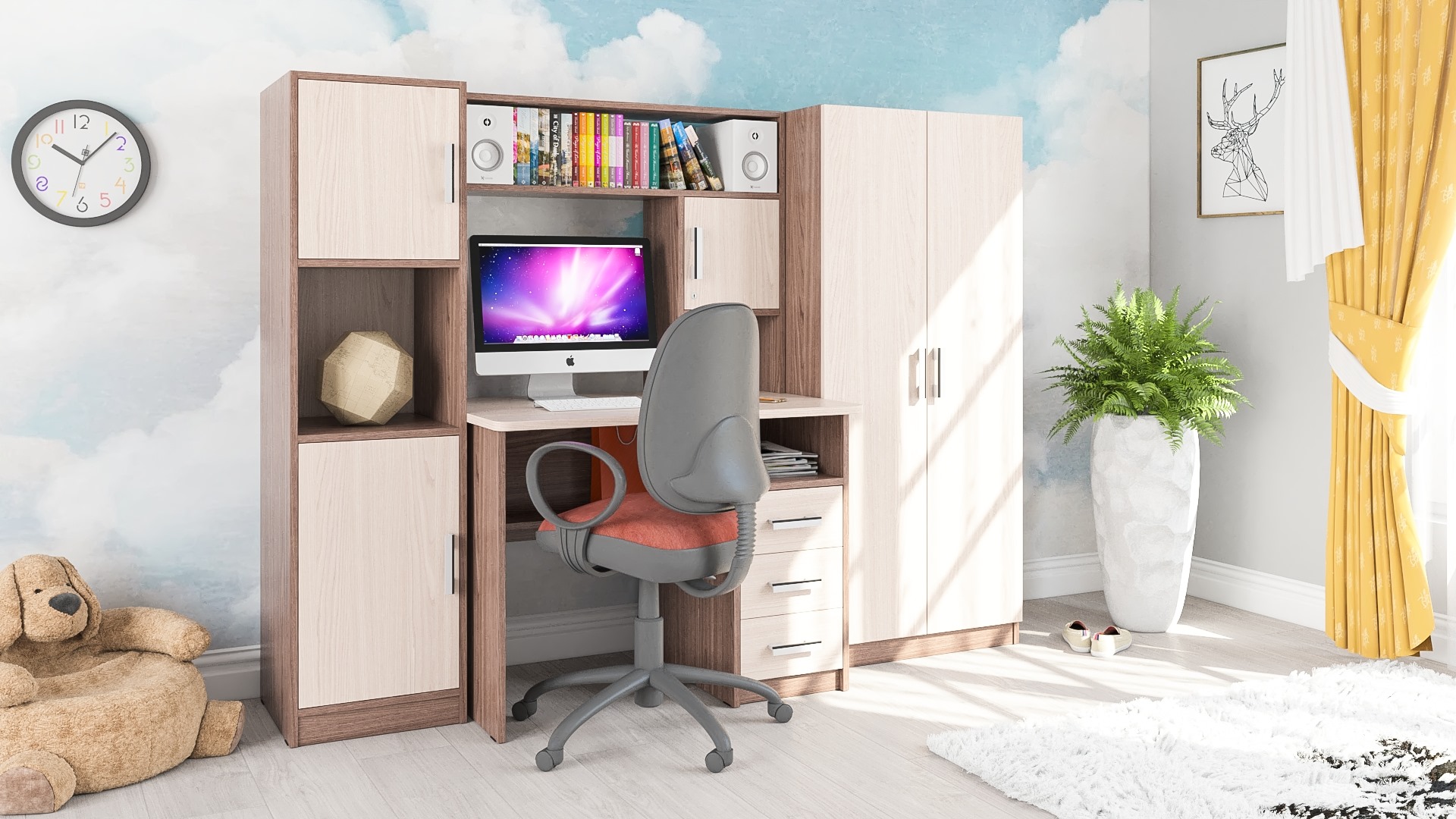 Все элементы мебели гармонично дополняют друг друга и составляют удобное рабочее место и вместительную систему хранения.