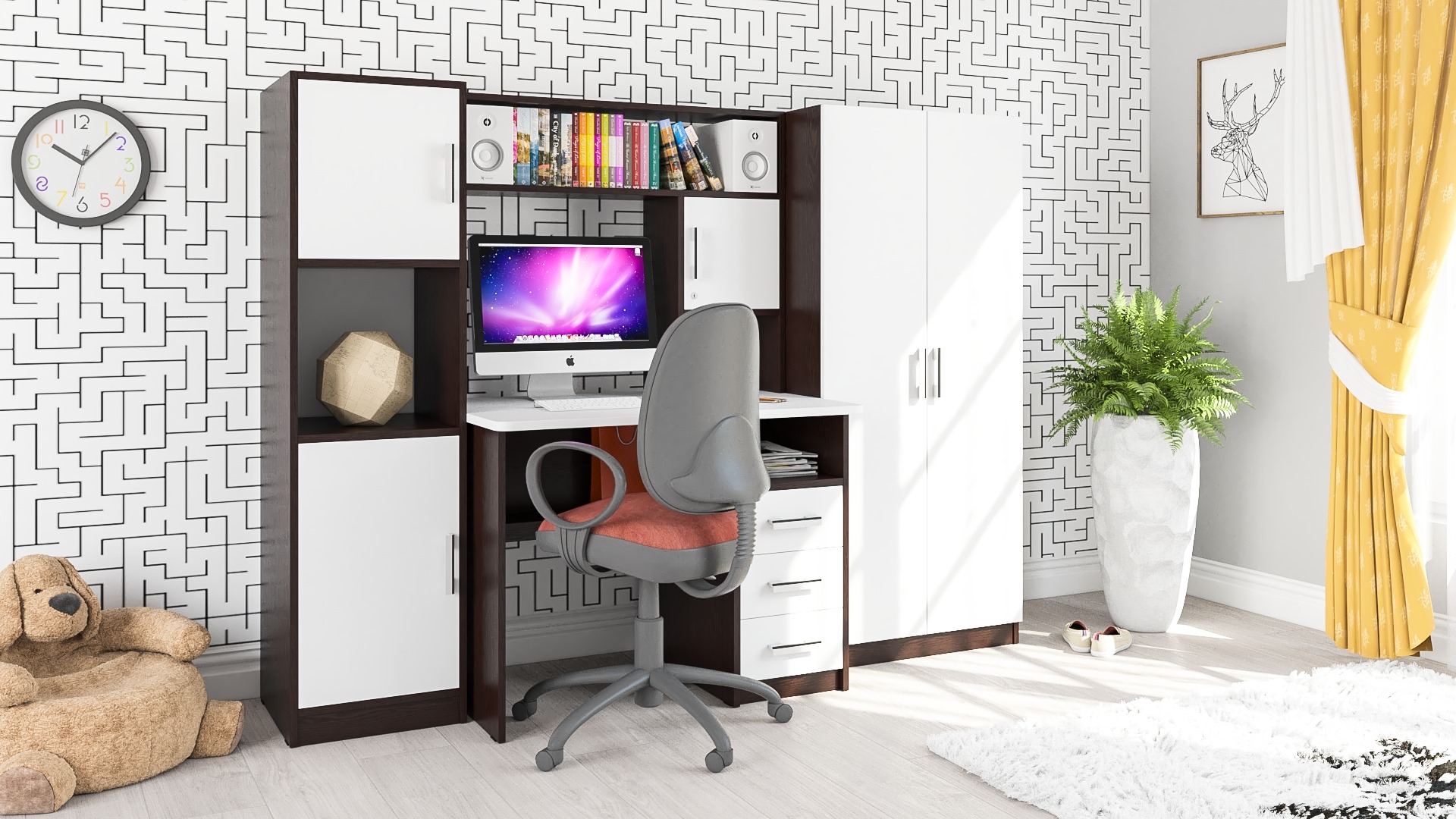 Все элементы мебели гармонично дополняют друг друга и составляют удобное рабочее место и вместительную систему хранения.