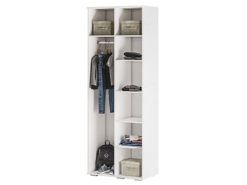 Универсальность сборки двухстворчатого шкафа ШК-09 как на правую, так и на левую сторону позволяет хранить вещи в удобном для ребенка варианте. Платяное отделение оснащено хромированной штангой овальной формы и антресольной полкой. Второе отделение шкафа имеет шесть полочных отделов.
