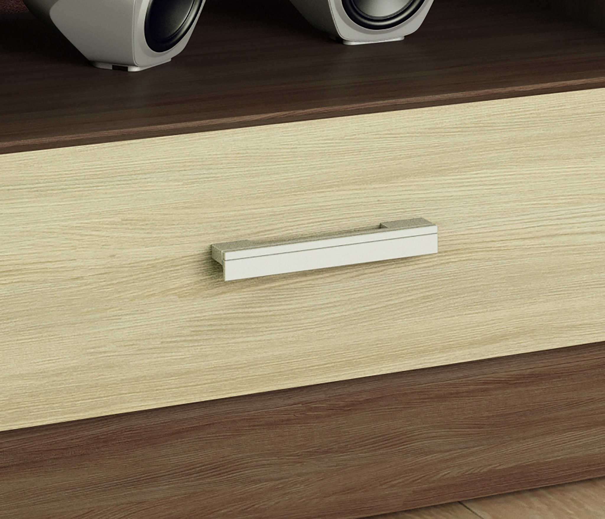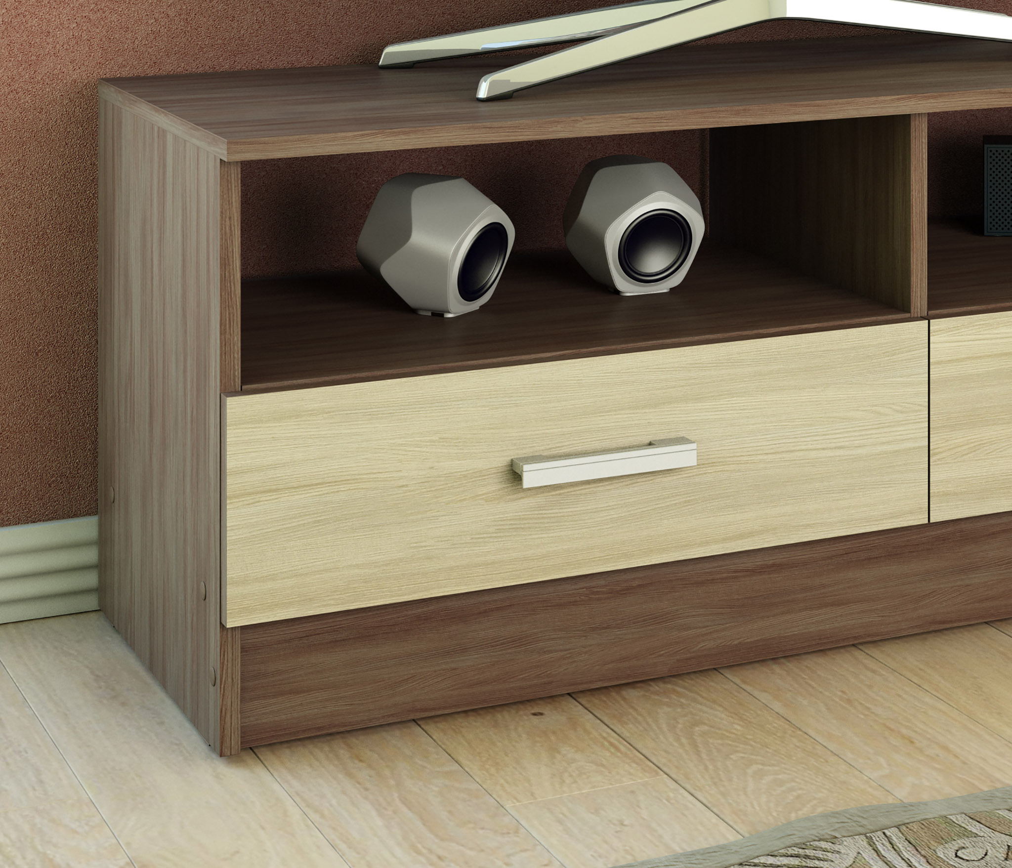 Простая, но практичная ТВ-тумба прекрасно подойдет для обустройства современного интерьера. Широкие полки и ящики позволят с удобством разместить технику и сопутствующие аксессуары.
