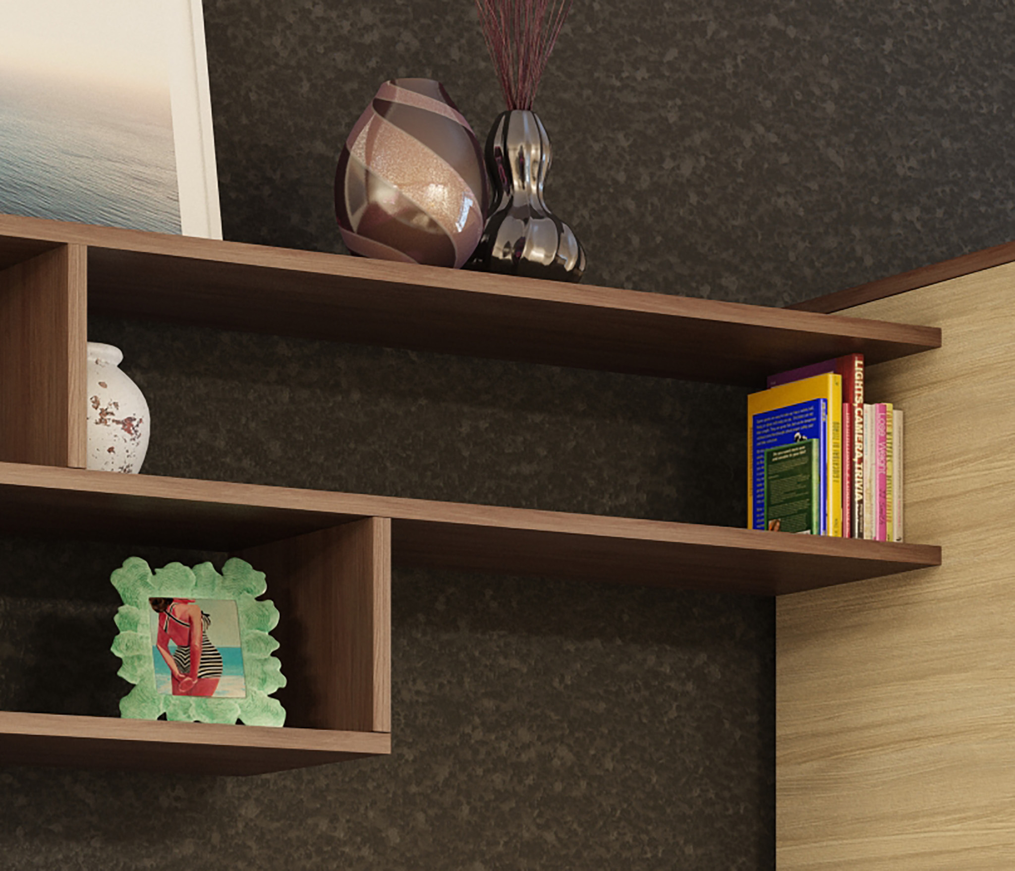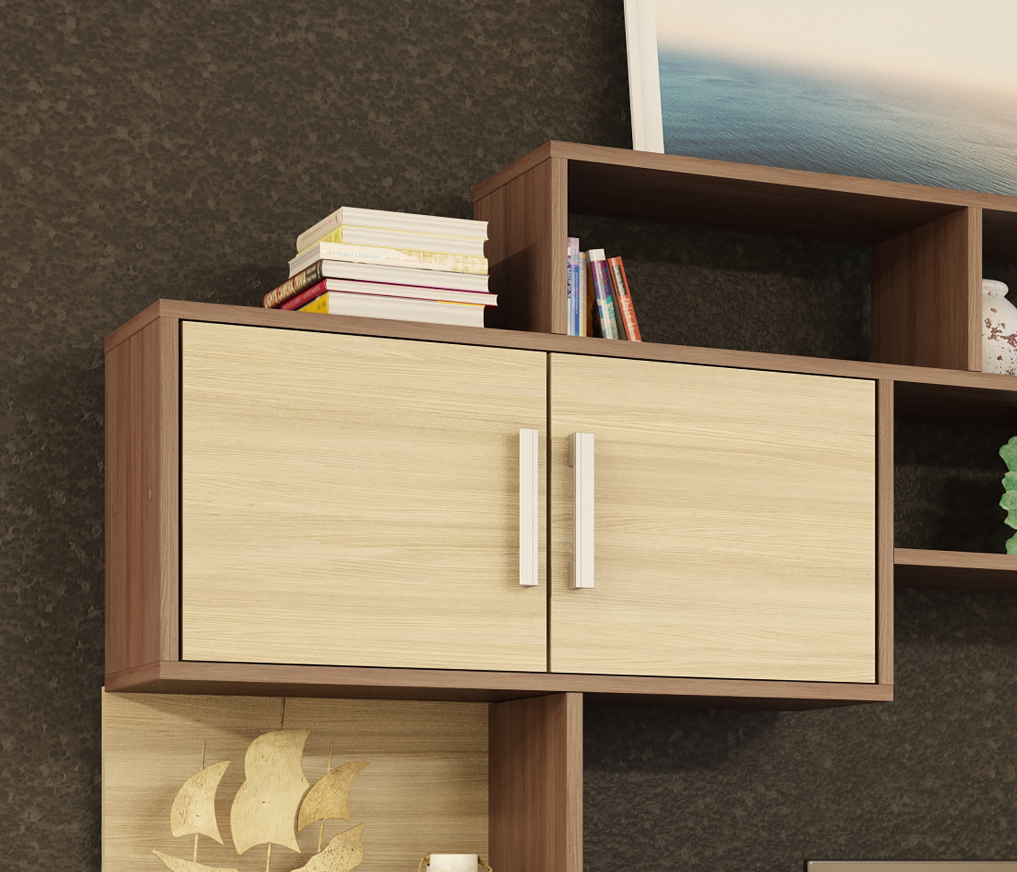 Конструкцией предусмотрен шкаф с полками для хранения одежды, постельного белья и других вещей. В основании располагаются открытые ниши и закрытые отделения. По периметру стенка имеет полки разных размеров для книг, фотографий, предметов интерьера и других мелочей.