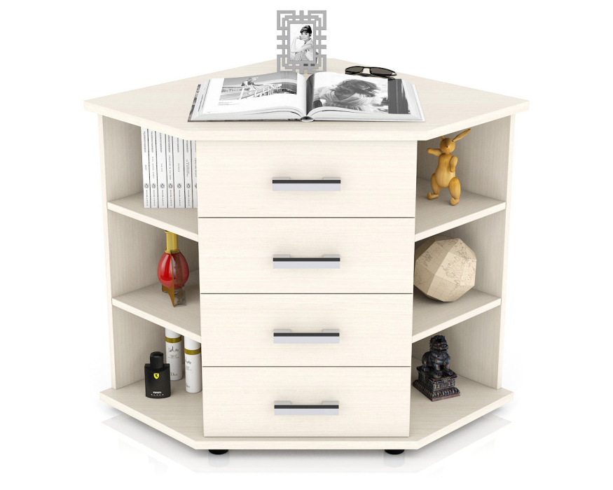 Угловой комод с открытыми полками МД-К12П - многофункциональный предмет обстановки современного дома. Модный дизайн, оригинальная форма и предлагаемая интересная цветовая палитра делают комод достойным Вашего выбора. Комод оборудован четырьмя вместительными выдвижными ящичками и симметричными боковыми открытыми нишами с двумя полками. На ящичках установлены практичные ручки, обеспечивающие комфортный доступ и универсальное сочетание с любым интерьером. Удобная угловая конструкция и большая столешница комода существенно расширяют горизонты его востребовательности. Комод может послужить и удобной тумбой под телевизор, и дамским туалетным столиком, и тумбой для канцелярии и документов в офисе. И везде комод стильно выделит и украсит отведенный ему уголок и профессионально выполнит поставленную задачу! Долгую службу комода гарантируют современный способ производства, высококачественные экологически безопасные материалы, фурнитура. Ламинированная плита, из которой сделан комод, имеет гигиенический сертификат Е1 и относится к самой безопасной группе ДСП. Края столешницы комода обработаны кромкой ABS - 2 мм., остальные детали кромкой ABS - 0,4 мм. Мебельная кромка ABS - самая прогрессивная форма защиты торцов изделия, ударопрочная, без деформации и выделения вредных веществ. Модель установлена на пластиковые подпятники для защиты поверхности пола от повреждений. Угловой комод с открытыми полками С-МД-К12П - практичное использование угла комнаты - стильно и с пользой!