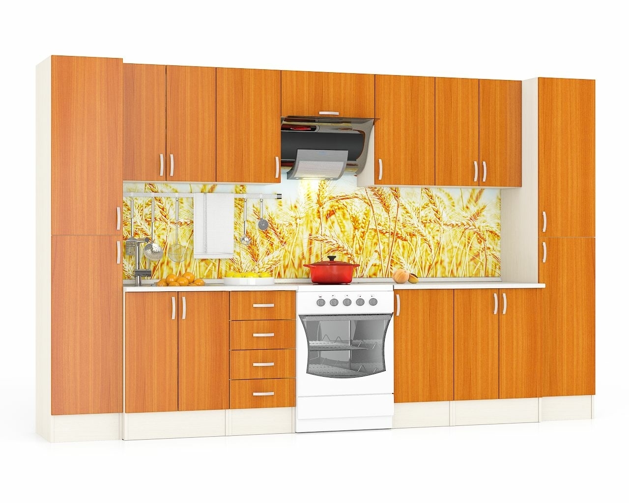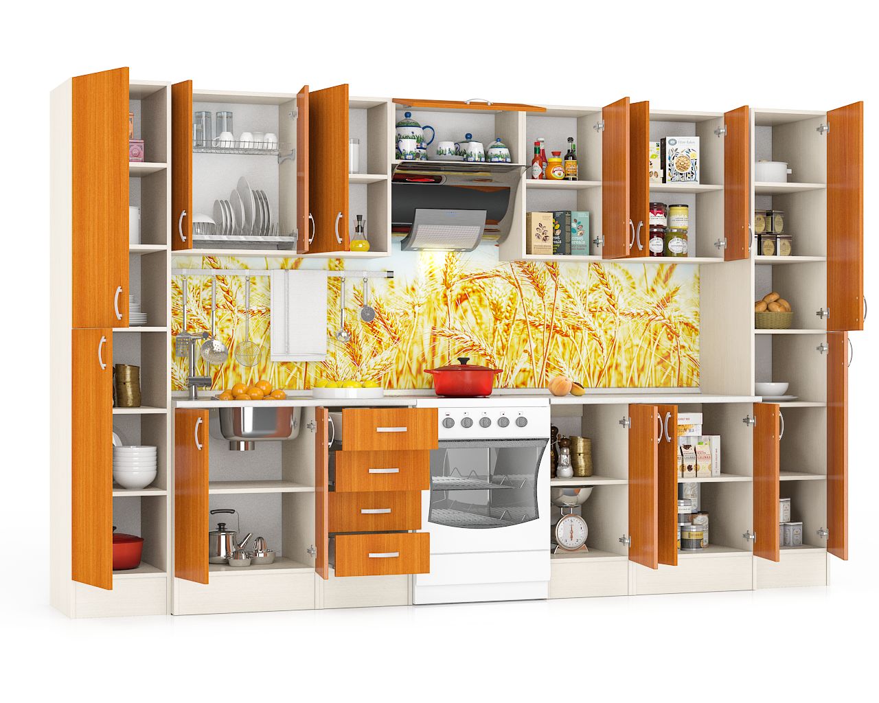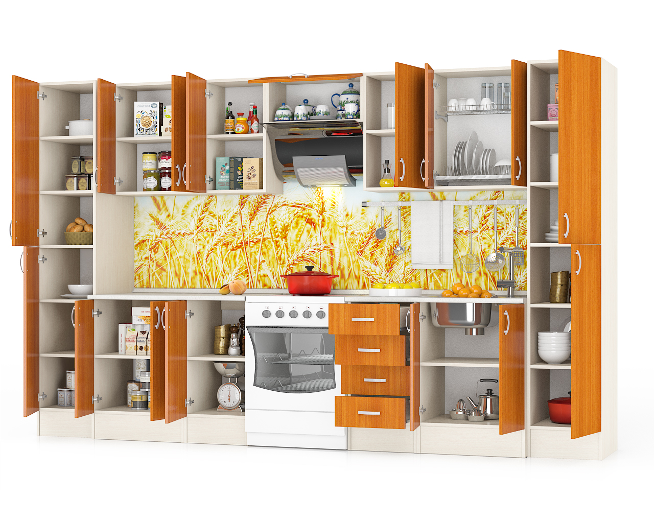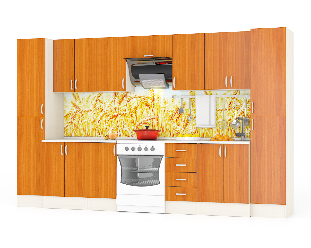 Кухня на заказ Мери 11 - удобный мебельный ансамбль с солидной системой хранения и модной эстетикой дизайна. Выполненная в стиле модерн, кухня Мери станет находкой для любителей современного направления в оформлении интерьера. Стандартные и компактные, горизонтальный и с ящиками, эргономичные модули кухни объединены в удобный и эффектный ансамбль. Изюминка кухни Мери 11, два вместительных и эргономичных пеналов 40 см. - практичный тренд комфортной, модной кухни! Верхний ярус кухни включает пять модулей - два однодверных шкафа 40 см., два двудверных шкафа 60 см. и горизонтальный шкаф над вытяжкой 60 см. Нижний ярус кухни состоит из двух двудверных столов 60 см., однодверного стола 40 см. и стола с 4 ящиками 40 см. Все модули с распашными дверками имеют внутреннюю полку, за подъёмной дверью горизонтального шкафа - ниша. Такой состав кухни поможет с максимальным удобством использовать полезную площадь кухни. Обращаем внимание, что порядок размещения модулей кухни Вы определяете сами, согласно своим предпочтениям. Бонусом данной кухни является уже закромленная столешница (цвет столешницы № 130 сахара белая) для каждого стола своя и нижний цоколь, входящие в комплект поставки. И, конечно же, стоит обратить внимание на экономическую составляющую - цена кухни Мери просто подарок для семейного бюджета. Кухня Мери выполнена из экологически безопасной высокого качества ламинированной ДСП 16 мм. Торцы фасадов кухни закромлены 2-х миллиметровой противоударной кромкой ABS. Торцы остальных деталей - кромкой ПВХ - 0,4 мм. Использование лучшей фурнитуры отечественного и импортного производства повышает уровень качества кухни и срок её службы. Кухня Мери соответствует ГОСТу и санитарно-эпидемиологическим нормам, сертифицирована и имеет соответствующие документы. Поставка кухонных модулей производится в разобранном виде, надёжно упакованными, с приложенной подробной инструкцией по сборке. Обращаем Ваше внимание, что заднюю панель (фартук), встроенную технику, мойки, смесители для кухни, воздухоочистители Вы приобретаете отдельно. Кухня на заказ Мери 11 - достойная кухня за реальные деньги!