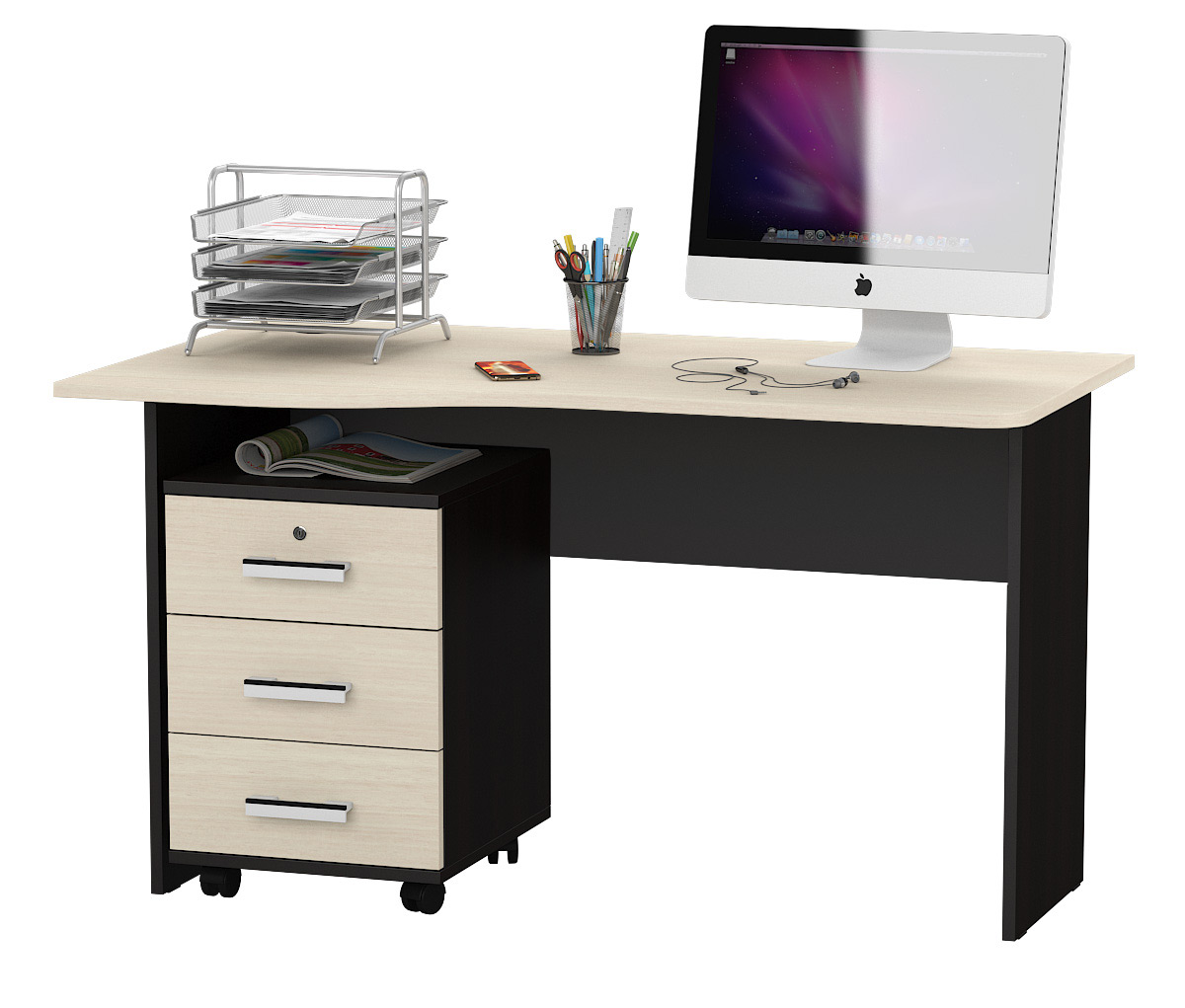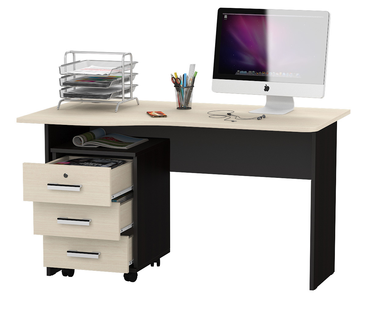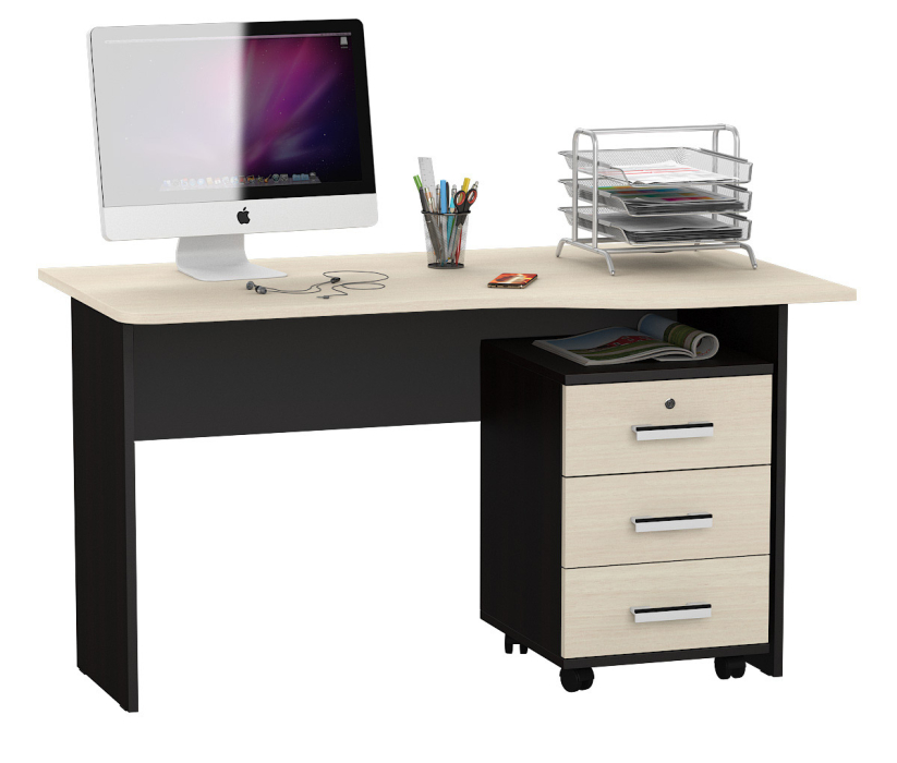 Стол с подкатной тумбой МД 1.04Т - удобный стол с подкатной тумбой на колёсиках - удачное сочетание для эффективного умственного труда! Прочный стол с большой, удобной столешницей, размером 130х75 см., - основа Вашего эргономичного рабочего места. Конструкция этого современного стола позволяет комфортно расположить монитор компьютера, оставляя достаточно места для книг и канцелярии. Надёжные стойки стола организовуют нишу-ограждение для системного блока, охраняя его от внешнего повреждения. Удобная, мобильная тумба, с тремя выдвижными ящиками, идеальное решение проблемы хранения деловых бумаг и канцелярии. Верхний ящик тумбы закрывается на ключ, что позволит хранить там важные документы или очень «личные» вещи. Компактный тумбы позволит Вам «доукомплектовать» стол, аккуратно разместив её под столешницей. Тумба установлена на колёсики и быстро перемещается в нужное место, что удобно при коллективном пользовании справочниками или техникой. Стильный, лаконичный дизайн набора мебели позволит ему легко интегрировать в модный интерьер современного кабинета или престижного офиса.