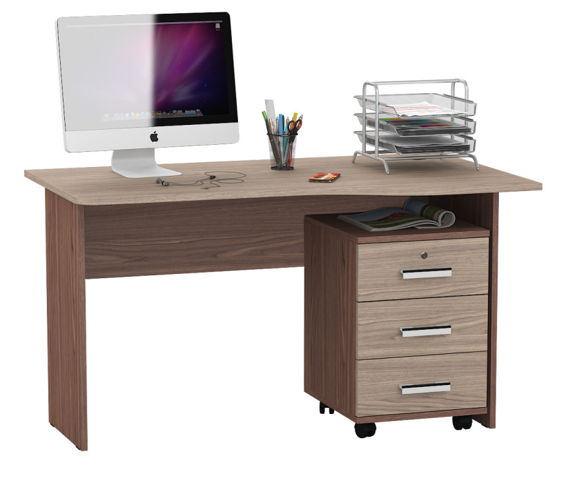 Стол с подкатной тумбой МД 1.04Т - удобный стол с подкатной тумбой на колёсиках - удачное сочетание для эффективного умственного труда! Прочный стол с большой, удобной столешницей, размером 130х75 см., - основа Вашего эргономичного рабочего места. Конструкция этого современного стола позволяет комфортно расположить монитор компьютера, оставляя достаточно места для книг и канцелярии. Надёжные стойки стола организовуют нишу-ограждение для системного блока, охраняя его от внешнего повреждения. Удобная, мобильная тумба, с тремя выдвижными ящиками, идеальное решение проблемы хранения деловых бумаг и канцелярии. Верхний ящик тумбы закрывается на ключ, что позволит хранить там важные документы или очень «личные» вещи. Компактный тумбы позволит Вам «доукомплектовать» стол, аккуратно разместив её под столешницей. Тумба установлена на колёсики и быстро перемещается в нужное место, что удобно при коллективном пользовании справочниками или техникой. Стильный, лаконичный дизайн набора мебели позволит ему легко интегрировать в модный интерьер современного кабинета или престижного офиса.
