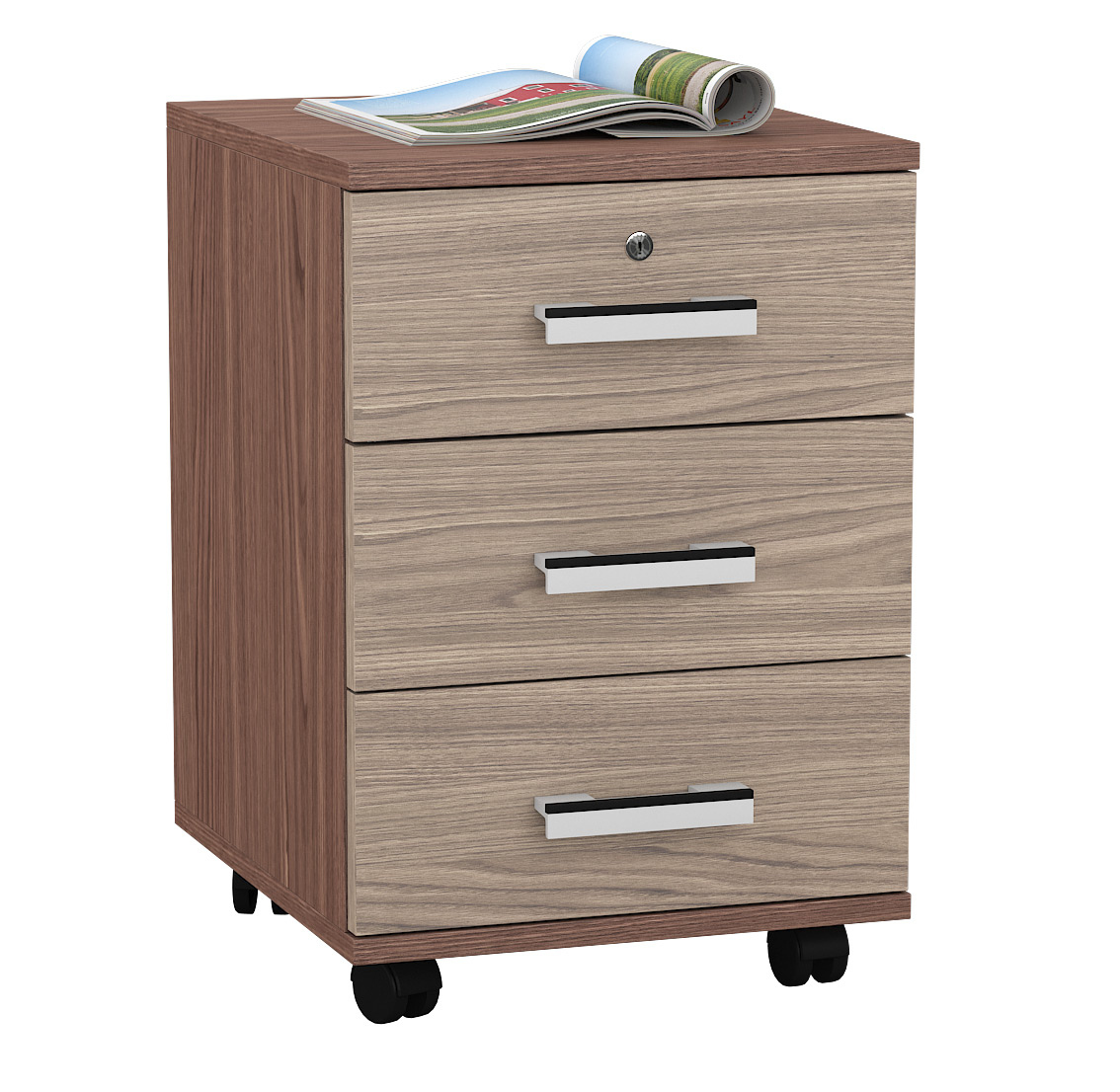 Тумба на колёсиках МД 3.02 - комфорт, практичность и доступная цена! Удобная, мобильная тумба с тремя выдвижными ящиками - идеальное решение проблемы расширения «складских мест» дома и в офисе. По Вашему желанию тумба послужит хранителем деловых бумаг в кабинете, косметики в спальне или «перчаточным» ящичком в прихожей. Компактный тумбы позволит Вам «доукомплектовать» письменный стол, аккуратно разместив её под столешницей. Верхний ящик тумбы закрывается на ключ, что позволит хранить там важные документы или очень «личные» вещи. Тумба установлена на колёсики и быстро перемещается в нужное место, что удобно при коллективном пользовании справочниками или техникой.