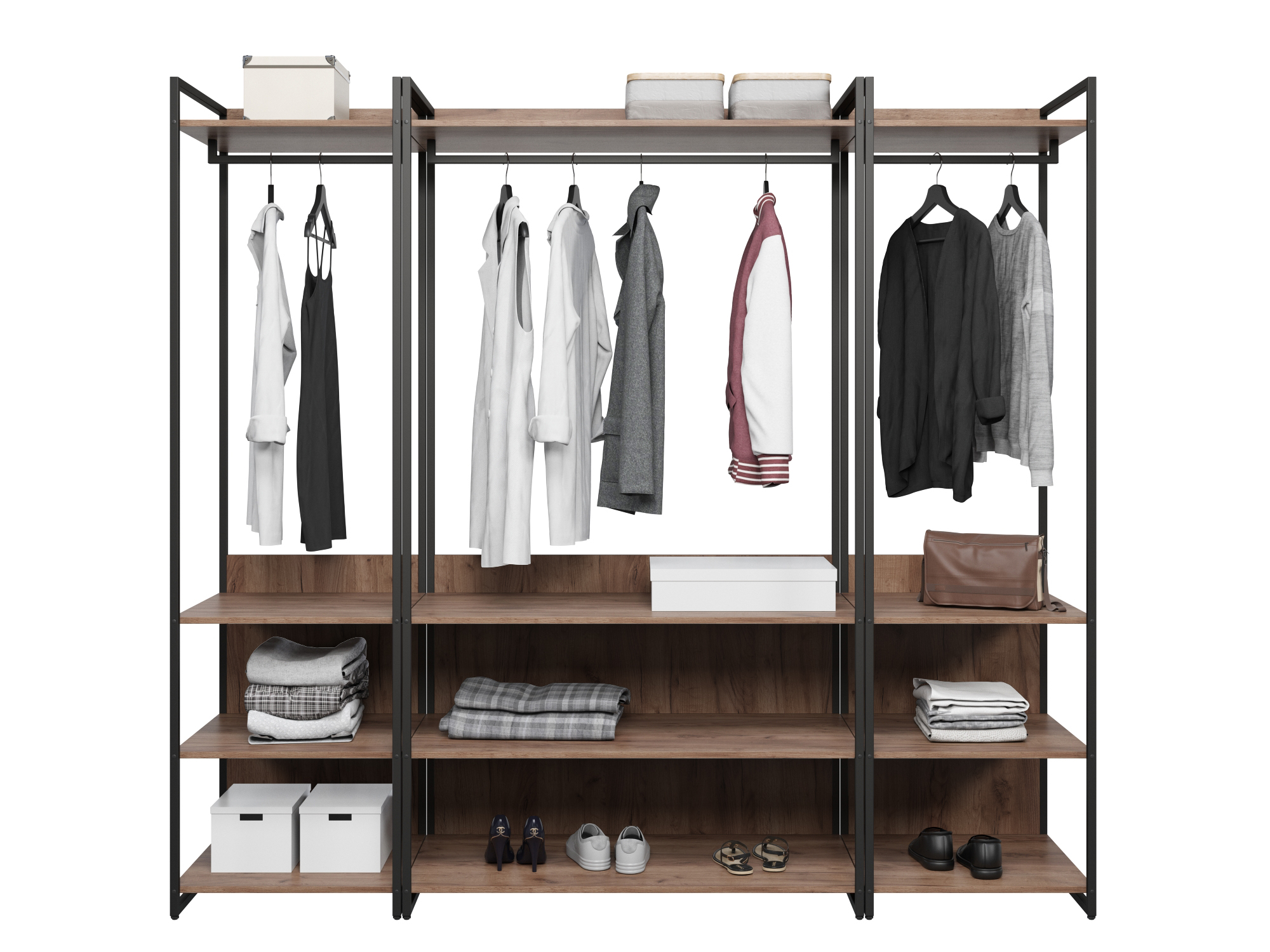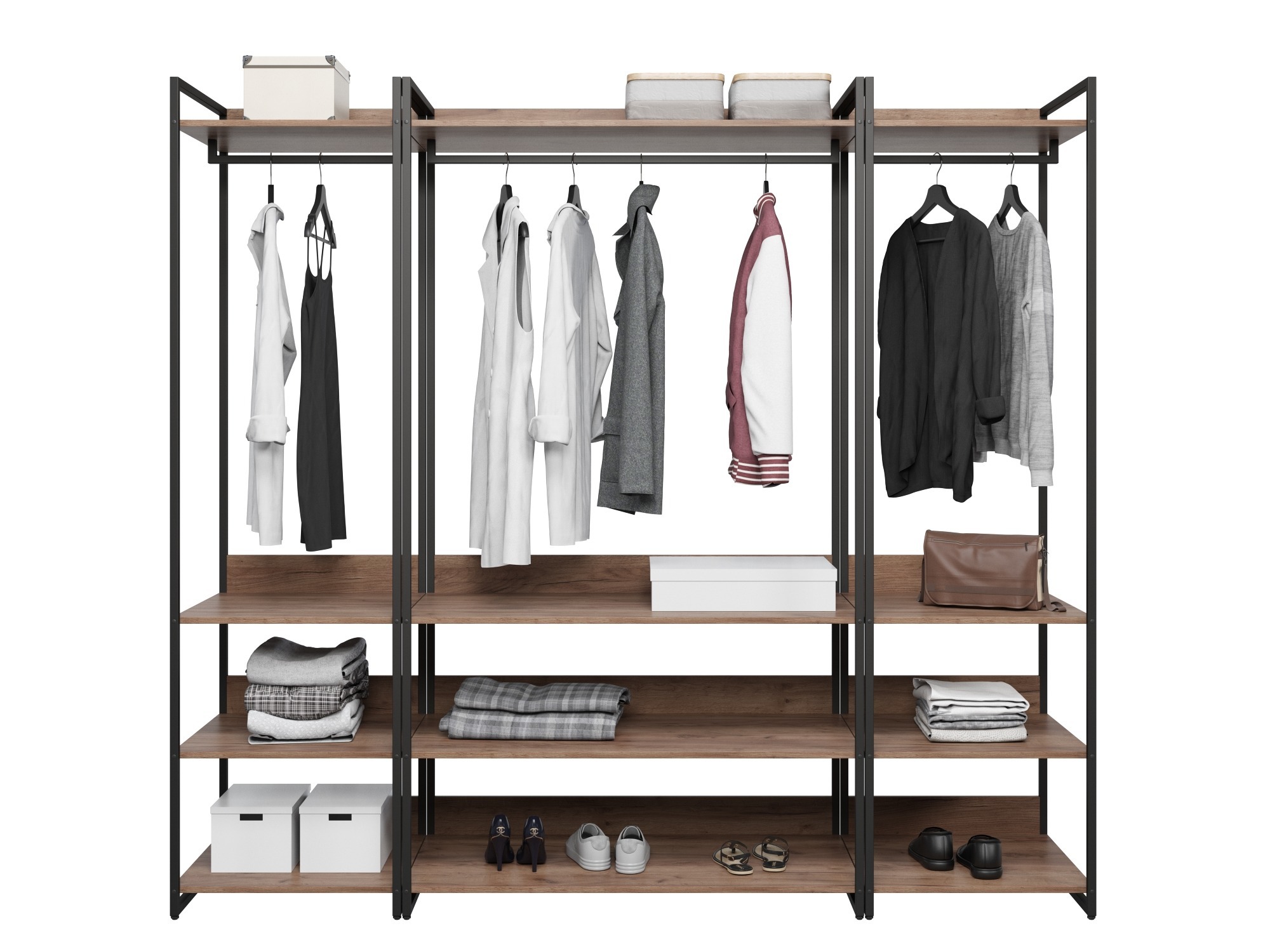 Каркас выполнен из металлического профиля 20х20 мм покрашенного порошковой краской, корпус и фасады из ЛДСП 16 мм, цвет дуб крафт табак. Каждый модуль имеет пластиковые ножки регулируемые по высоте.