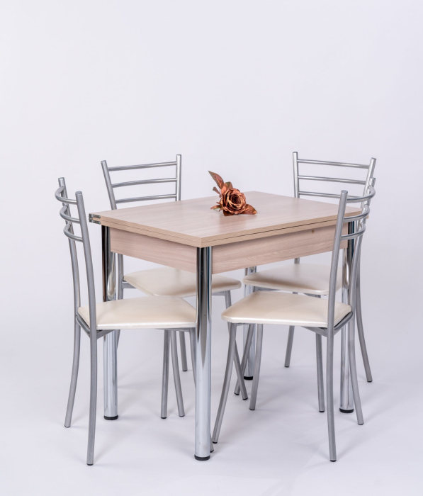 Обеденная группа состоит из стола раскладного в сложенном виде 60*80,в разложенном 80*120см..Ножки Хромированные труба d-50 регулируемая .В комплекте 4 Стула на металлокаркасе,сидение мягкое(наполнение поролон,обивка экокожа).