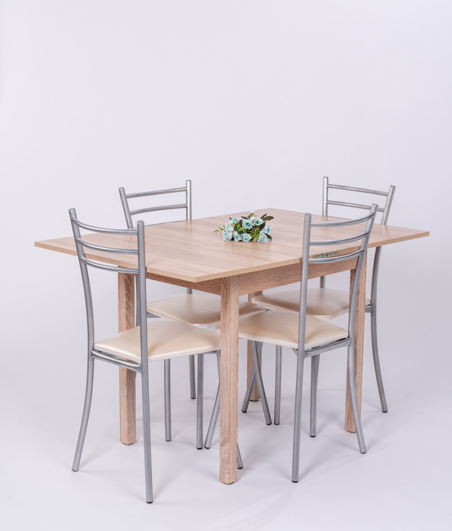 Обеденная группа состоит из стола раскладного в сложенном виде 60*80,в разложенном 80*120см..Ножки деревянные .В комплекте 4 Стула на металлокаркасе,сидение мягкое(наполнение поролон,обивка экокожа).
