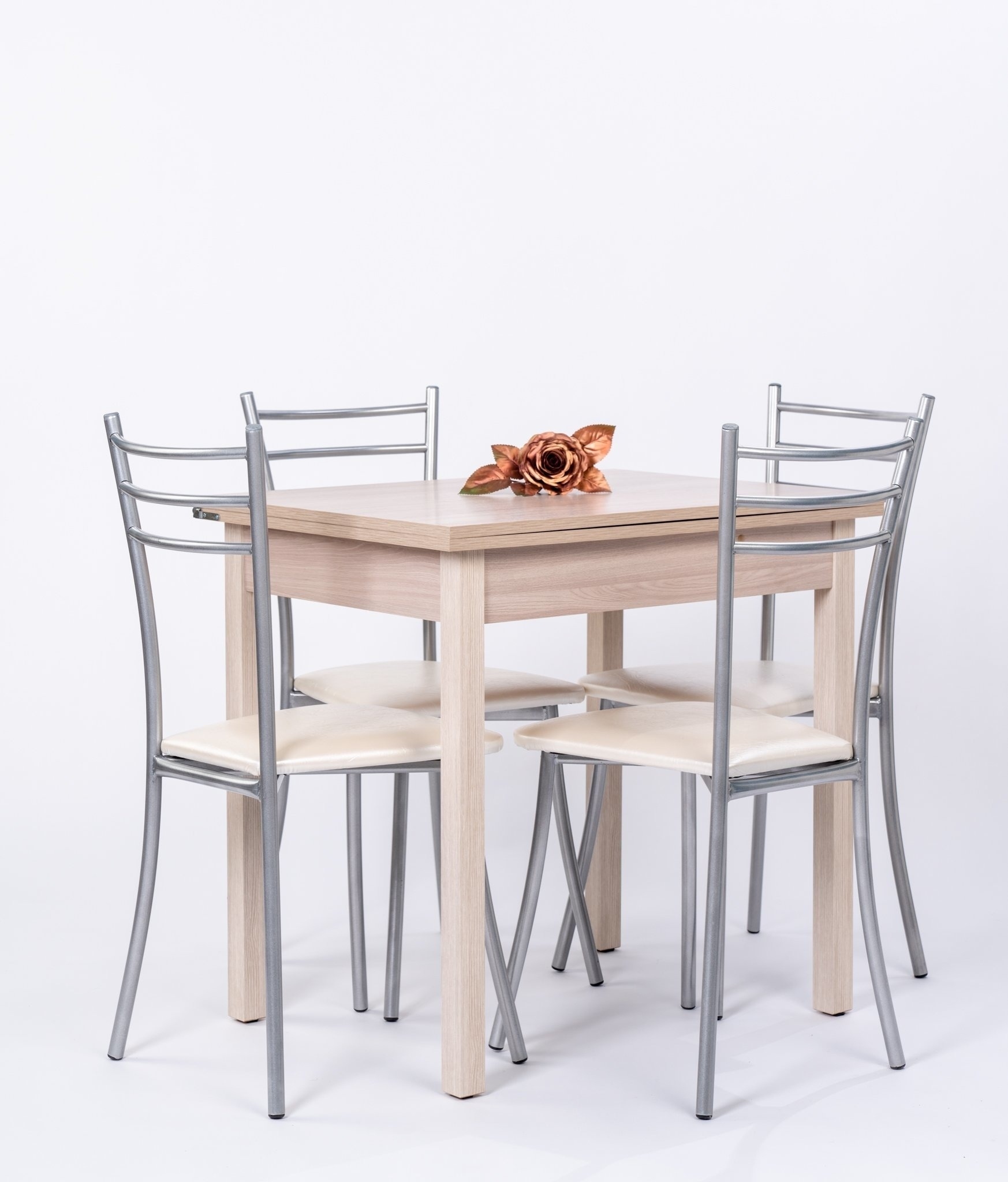 Обеденная группа состоит из стола раскладного в сложенном виде 60*80,в разложенном 80*120см..Ножки деревянные .В комплекте 4 Стула на металлокаркасе,сидение мягкое(наполнение поролон,обивка экокожа).