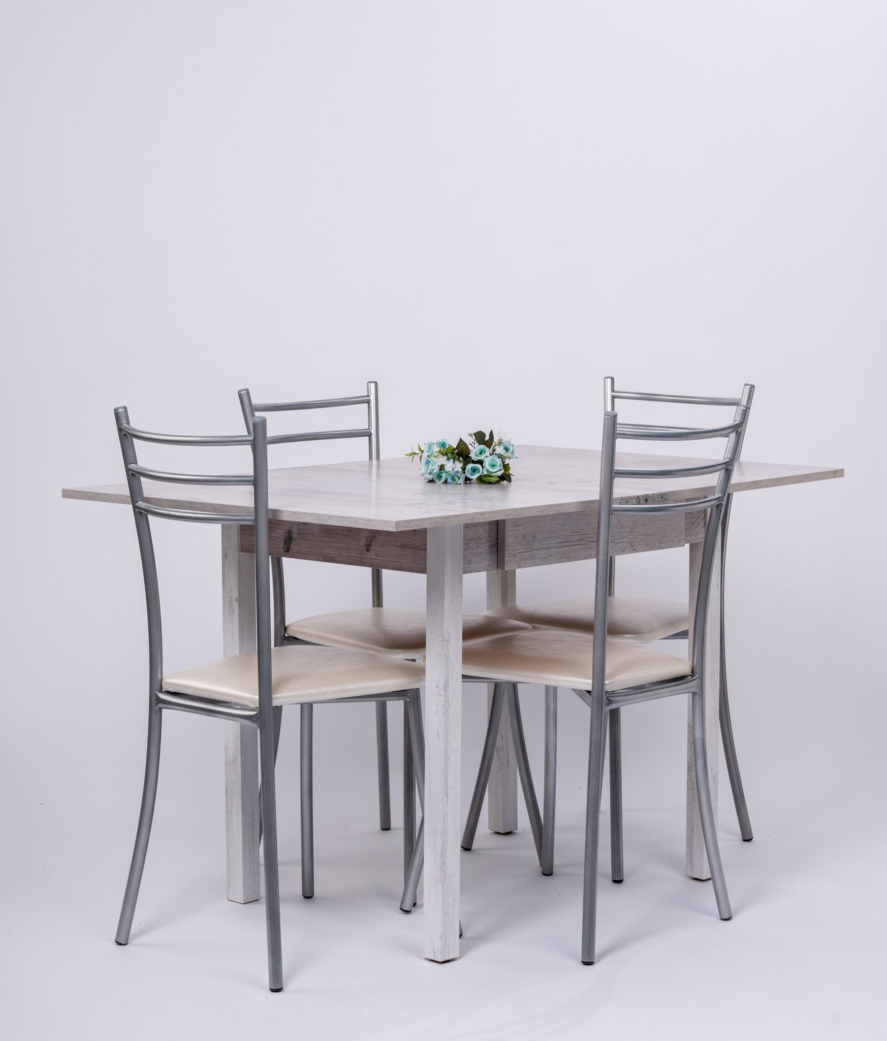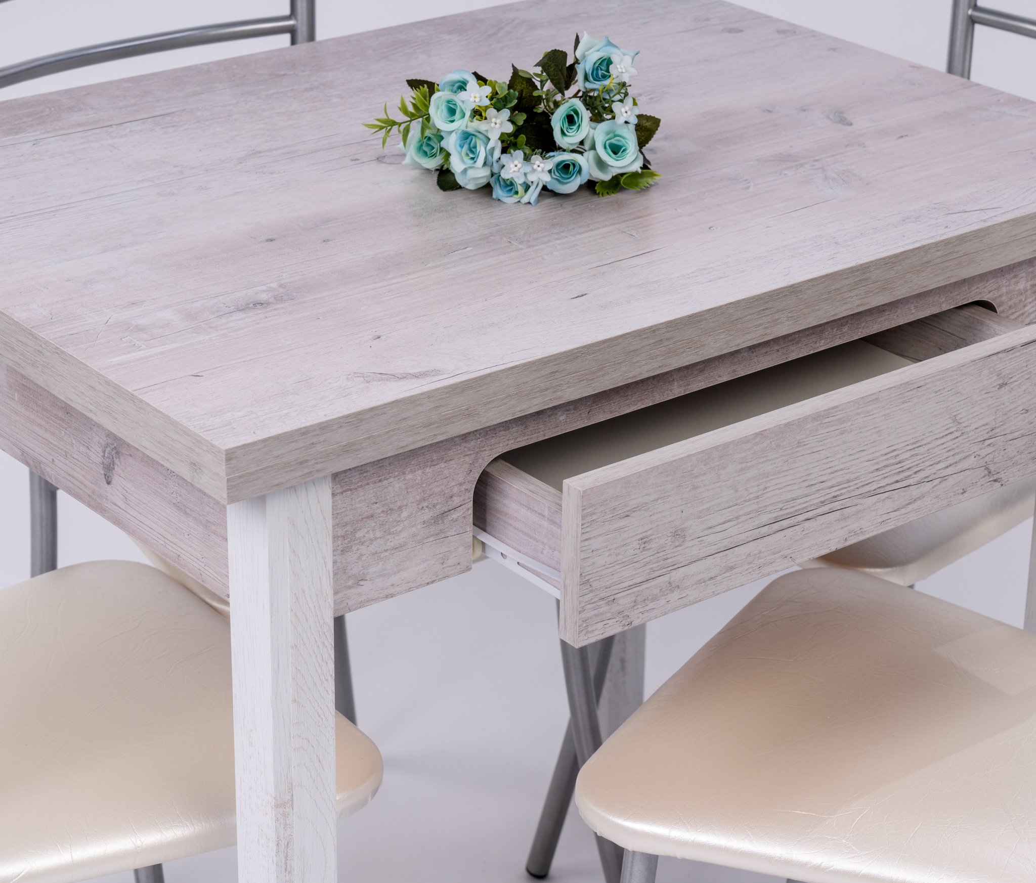 Обеденная группа С Ящиком состоит из стола раскладного в сложенном виде 60*80,в разложенном 80*120см.Стол оснащён выдвижным ящиком для столовых приборов..Ножки деревянные .В комплекте 4 Стула на металлокаркасе,сидение мягк0е (наполнение поролон,обивка экокожа).