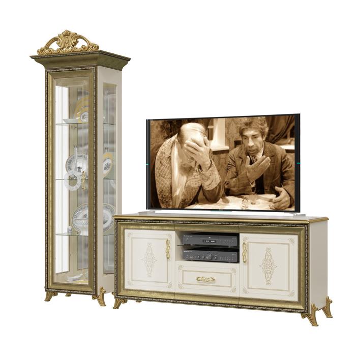 Версаль ГВ-01К+ГВ-03 - элегантный комплект из шкафа-витрины и тумбы TV создан для Вашей респектабельной гостиной! Компактный шкаф 1-дверный с великолепным эксклюзивным декором - изысканная горка для фамильной посуды и хрусталя. Шкаф с стеклянными дверкой, боковыми вставками и 3 полками, увенчанный великолепной короной, выглядит воздушным и сказочно красивым. Эффектное отражение посуды в зеркальных задних стеночках шкафа внесёт в оформление гостиной яркие цветовые акценты и сияние света. Светильнички, встроенные над верхней полкой шкафа, добавляя игристые отблески от зеркал, станут креативным источником освещения в гостиной. Дверка шкафа имеет универсальную сборку. Стекло двери украшено тонким витиеватым орнаментом и пескоструйной розеткой. Аристократичная и практичная тумба TV - презентабельное основание для современного домашнего кинотеатра! Тумба, с широкой надёжной столешницей, оборудована по боками - двумя закрытыми отделениями, в центре - открытой нишей и выдвижным ящиком. Вместительные отделения с полкой за распашной дверью и ниша с стеклополкой удобно разместят многочисленные атрибуты семейного отдыха. Версаль ГВ-01К+ГВ-03 - элементы из набора мебели Версаль.