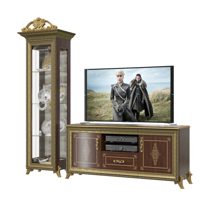 Версаль ГВ-01К+ГВ-03 - элегантный комплект из шкафа-витрины и тумбы TV создан для Вашей респектабельной гостиной! Компактный шкаф 1-дверный с великолепным эксклюзивным декором - изысканная горка для фамильной посуды и хрусталя. Шкаф с стеклянными дверкой, боковыми вставками и 3 полками, увенчанный великолепной короной, выглядит воздушным и сказочно красивым. Эффектное отражение посуды в зеркальных задних стеночках шкафа внесёт в оформление гостиной яркие цветовые акценты и сияние света. Светильнички, встроенные над верхней полкой шкафа, добавляя игристые отблески от зеркал, станут креативным источником освещения в гостиной. Дверка шкафа имеет универсальную сборку. Стекло двери украшено тонким витиеватым орнаментом и пескоструйной розеткой. Аристократичная и практичная тумба TV - презентабельное основание для современного домашнего кинотеатра! Тумба, с широкой надёжной столешницей, оборудована по боками - двумя закрытыми отделениями, в центре - открытой нишей и выдвижным ящиком. Вместительные отделения с полкой за распашной дверью и ниша с стеклополкой удобно разместят многочисленные атрибуты семейного отдыха. Версаль ГВ-01К+ГВ-03 - элементы из набора мебели Версаль.