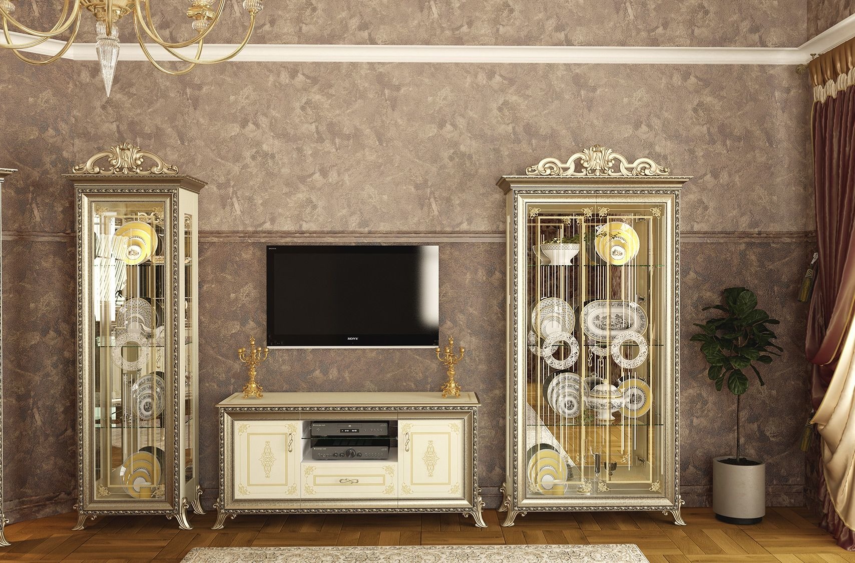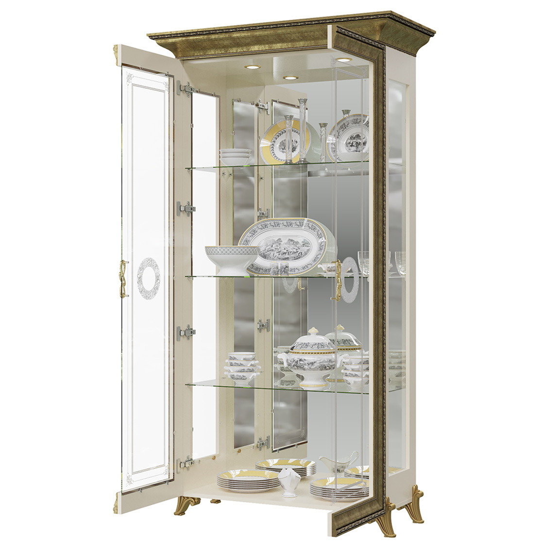 Очаровательный шкаф Версаль, выполненный в роскошном дворцовом стиле, внесёт в интерьер винтажные нотки шикарной старины. Аристократичный шкаф, сияющий золотой отделкой и фейерверком стекла - изысканная горка для Вашей фамильной посуды и хрусталя. Шкаф со стеклянными дверками, боковыми вставками и 3 полками, в обрамлении богатой рамки фасада, выглядит воздушным и сказочно красивым. Эффектное отражение посуды в зеркальных задних стеночках шкафа внесёт в оформление гостиной яркие цветовые акценты и сияние света. Светильнички, встроенные над верхней полкой шкафа, добавляя игристые отблески от зеркал, станут креативным источником освещения в гостиной. Стекла распашных дверок шкафа украшены фацетом, тонким витиеватым орнаментом и шикарной пескоструйной розеткой. Классика формы шкафа искусно дополнена богатством живописных декоративных элементов, созданных на основе инновационных технологий. Пышность декора, изящество карниза и изогнутых ножек шкафа наполняют обстановку комнаты в любом стиле яркостью и выразительностью. Шкаф Версаль произведен из высококачественных, экологичных материалов; корпуса - ламинированная ДСП 16 мм. фасады - МДФ 16 мм. Затейливый декор, красиво обрамляющий фасады шкафа, выполнен из прогрессивного материала - прочного и безопасного пенополиуретана. Автоматический кромкооблицовочный станок BRANDT Ambition, Германия, обеспечивает надёжную защиту всех деталей шкафа плёнкой ПВХ. Современное производство и контроль качества, подтверждённые сертификатом соответствия, позволили создать для Вас эту элитную мебель. Поставляется шкаф в гофроупаковке, сохраняющей товар в идеальном состоянии на протяжении всего срока хранения и транспортировки. Шкаф 2-х дверный Версаль ГВ-02 - олицетворение тонкого вкуса и роскоши!
