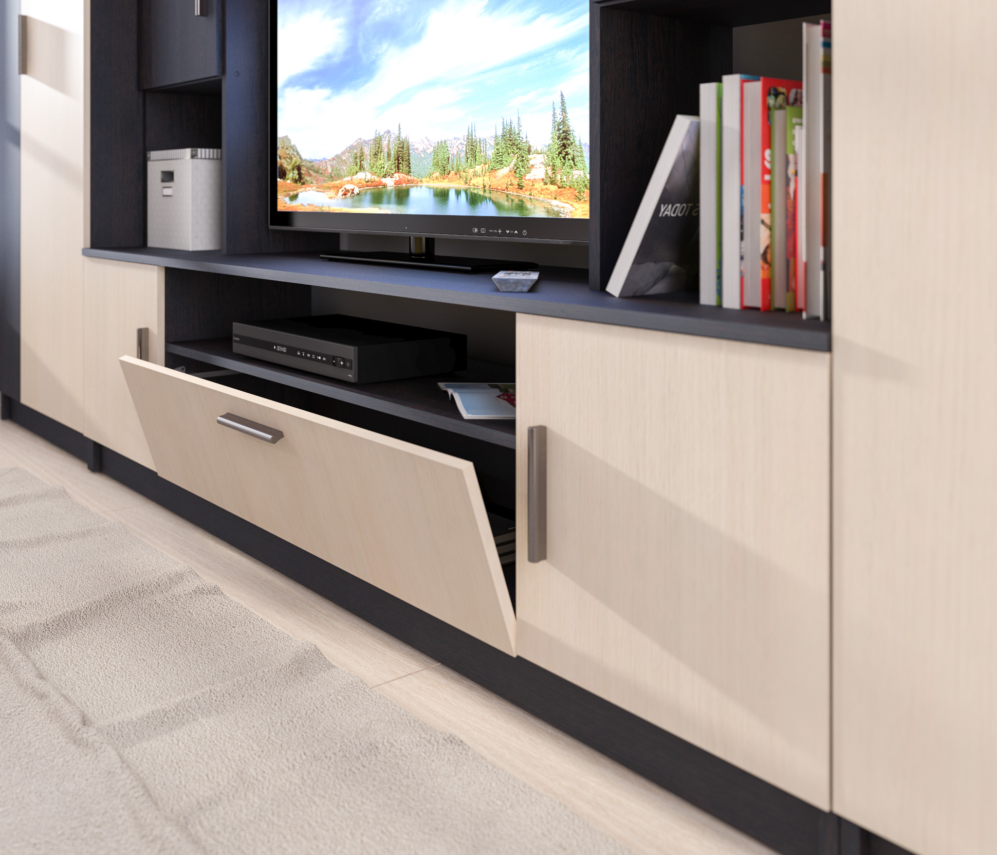 Интересный дизайн, вместительные ящики, невысокая цена, очень подходит под мой интерьер, красивая стенка.