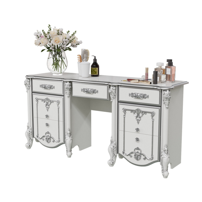 Стол туалетный Дольче Вита СДВ-05 - изысканное украшение будуара милых Дам. Роскошный двух тумбовый стол с семью вместительными выдвижными ящиками станет любимым местом «работы» Вашей прелестницы. Зеркало большой фигурной столешницы с золотым или серебрянным кантом, грация гнутых ножек, обилие ручной «позолоты» - всё это Дамы обожают и ценят! Стол туалетный - элемент из набора мебели для спальни Дольче Вита.