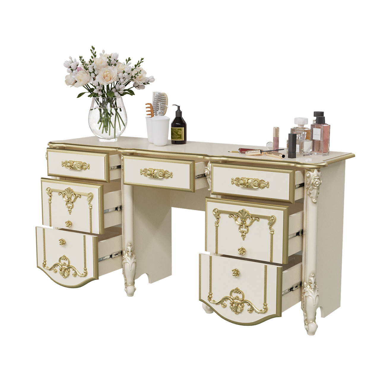 Стол туалетный Дольче Вита СДВ-05 - изысканное украшение будуара милых Дам. Роскошный двух тумбовый стол с семью вместительными выдвижными ящиками станет любимым местом «работы» Вашей прелестницы. Зеркало большой фигурной столешницы с золотым или серебрянным кантом, грация гнутых ножек, обилие ручной «позолоты» - всё это Дамы обожают и ценят! Стол туалетный - элемент из набора мебели для спальни Дольче Вита.