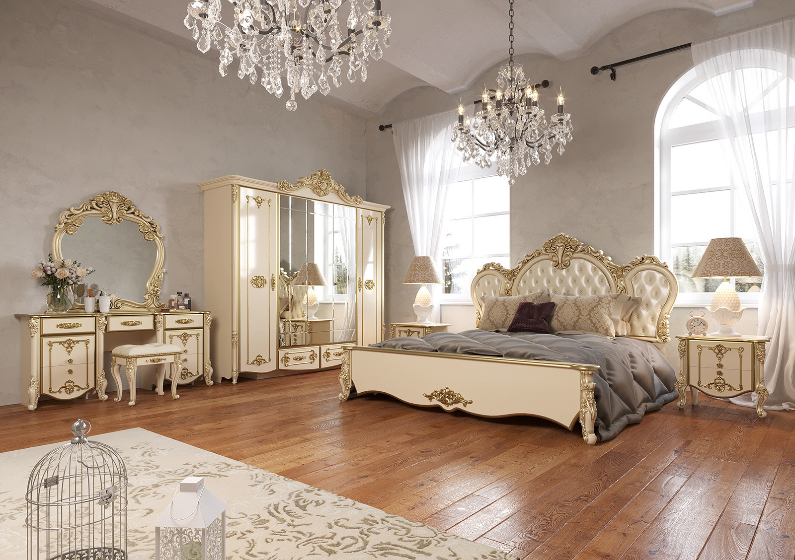 Описание линии мебели Дольче Вита: Спальня Дольче Вита - очарование совершенством! Коллекция Дольче Вита воплотила аристократическую изысканность дизайна и негу комфорта в элитном наборе мебели для роскошной спальни. Спальня Дольче Вита включает двуспальную кровать 1800, прикроватную тумбу, туалетный стол с пуфом и зеркалом, комод и 5-ти дверный шкаф. Каждый модуль спальни Дольче Вита - отдельное произведение искусства, а весь ансамбль вместе - шедевр мебельного мастерства! Романтический флёр белоснежного сияния глянца спальни Дольче Вита расцвечен золотой россыпью ажурных накладок, пилястр и корон. Накладной декор модулей спальни Дольче Вита уникален эксклюзивными рисунками филигранной резьбы и ручной росписью золотом. Сказочная прелесть спальни Дольче Вита - результат использования в её производстве передовых технологий финишной отделки мебели. Покрытие итальянским лаком УФ отверждения создаёт, стойкое к истиранию и удару, сверкающее зеркало фасадов спальни Дольче Вита. Спальня Дольче Вита произведена из высококачественных, экологически чистых материалов с использованием современной фурнитуры. Корпуса мебели спальни Дольче Вита изготовлены из ламинированной древесно-стружечной плиты 16 мм., фасады из лакированной МДФ 16 мм. Автоматический кромкооблицовочный станок BRANDT Ambition, Германия, обеспечивает надёжную защиту деталей мебели плёнкой ПВХ. Фигурный декор спальни Дольче Вита, изготовлен из прочного и безопасного пенополиуретана, обивка - износостойкая искусственная кожа. Зеркала спальни Дольче Вита украшены фацетом, мягкая обивка шикарного изголовья кровати выполнена методом каретной стяжки. Все модули спальни Дольче Вита прошли необходимое тестирование, отменное качество удостоверяют сертификаты соответствия. Спальня Дольче Вита - островок сбывшегося волшебства!