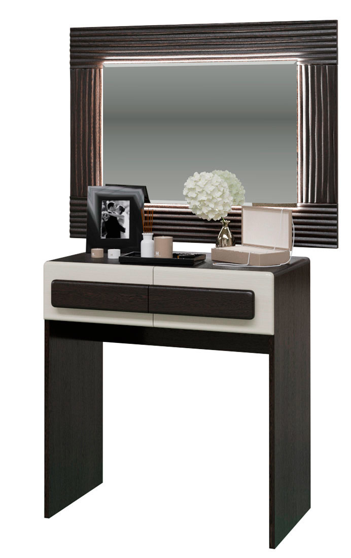 Столешница компактного стола предусмотрительно дополнена двумя выдвижными ящичками - так и места больше, и тайна красоты будет сохранена! Большое зеркало в шикарной раме, украшенное по краям фацетом и светодиодной подсветкой, поможет Вам ухаживать за собой в любое время суток! Расположение зеркала - горизонтальное. Светодиодная подсветка в комплекте. Элегантная классика формы и модный микс контрастных цветов - оригинальная идея дизайна набора мебели Престиж. Жемчужное льняное полотно фасада стола с 3-D фрезеровкой в темной рамке корпуса цвета венге цаво смотрится ярко и стильно. Приятная, скруглённая форма всех деталей мебели, включая интересные ручки-профили, придаёт ей уютный вид, располагает к отдыху. Использование современных технологий и экологических материалов в изготовлении мебели Престиж сделали её достойной своего названия. Основа производства Мэри-мебель - оборудование с числовым программным управлением, автоматические станки BRANDT Ambition, Германия. Отличная техника дополнена правильным подходом к делу - профессиональным мастерством и поэтапным контролем качества продукции. Коллекция мебели для спальни Престиж изготовлена из ламинированной ДСП 16 мм. с МДФ фасадами 16 мм., облицованными кромкой 0,4 и 2 мм. Мебель поставляется в гофроупаковке, сохраняющей товар в идеальном состоянии на протяжении всего срока хранения и транспортировки. Стол туалетный с зеркалом с подсветкой Престиж - отличные рекомендации Вашего вкуса!