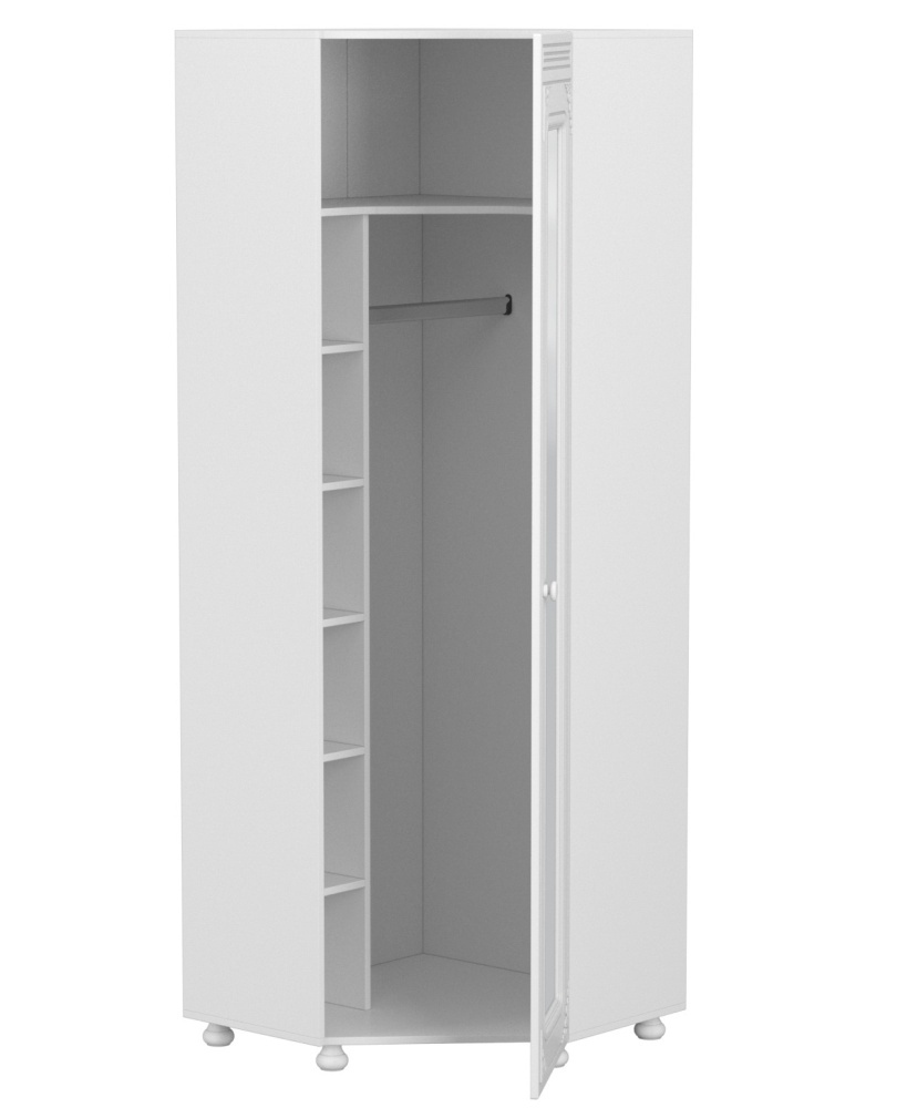 Материал корпуса/фасада: ЛДСП/МДФ с 3-D узором Цвет корпуса/фасада: белый структурный/белое дерево Размеры модуля (ш/г/в) в мм: 767х767х2160 Фурнитура: петли с доводчиками Высота опоры 65 мм Шикарный угловой распашной шкаф с шестью полками и одной штангой для вешалок. Особый шарм шкафу придает уникальный объемный фасад с 3D накладками.
