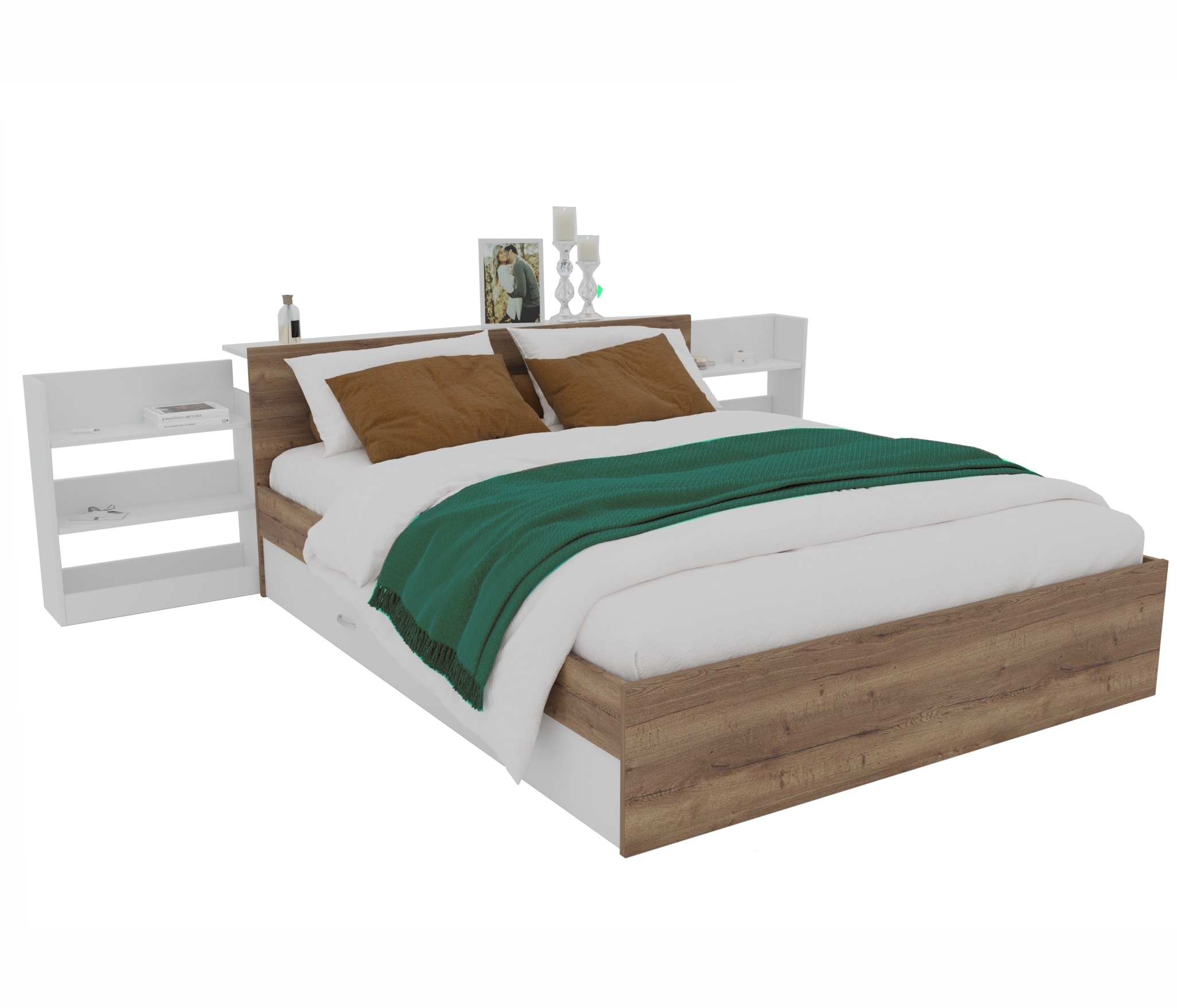 Двуспальная кровать Доминика 1400 с выдвижным блоком и ящиком в модной скандинавской текстуре "дуб золотой крафт"- очень функциональный и незаменимый предмет мебели в спальне. Изголовье кровати дополнено двумя выдвижными блоками. Горизонтальные полки в блоках позволяют разместить необходимые вещи – книги, крема, зарядные устройства и прочите негабаритные предметы. К изголовью кровати крепится полка. На ней с легкостью можно расположить предметы интерьера, которые украсят вашу спальню. Благодаря функционалу, кровать может быть расположена в спальне как в раздвинутом виде, так и в задвинутом.