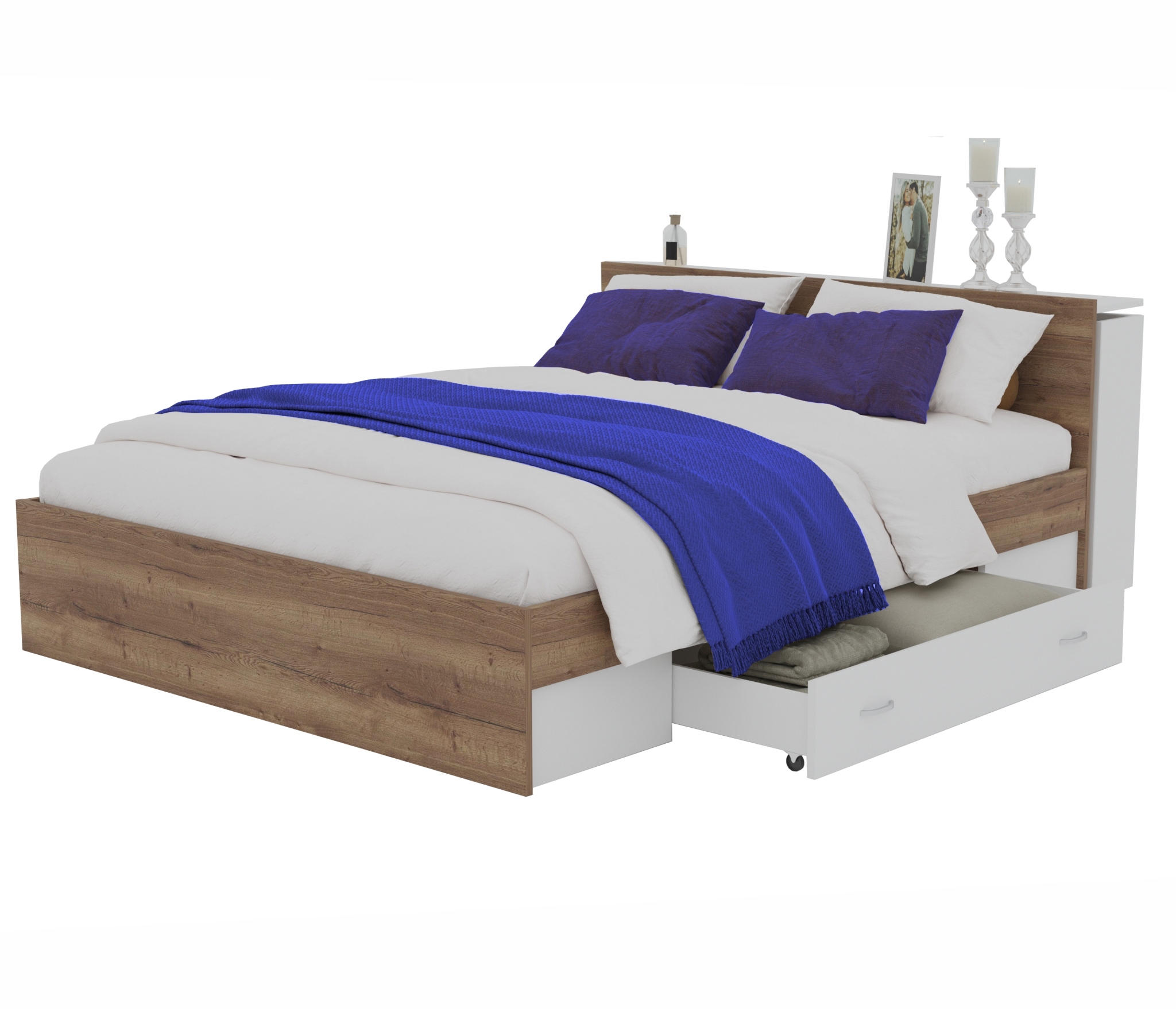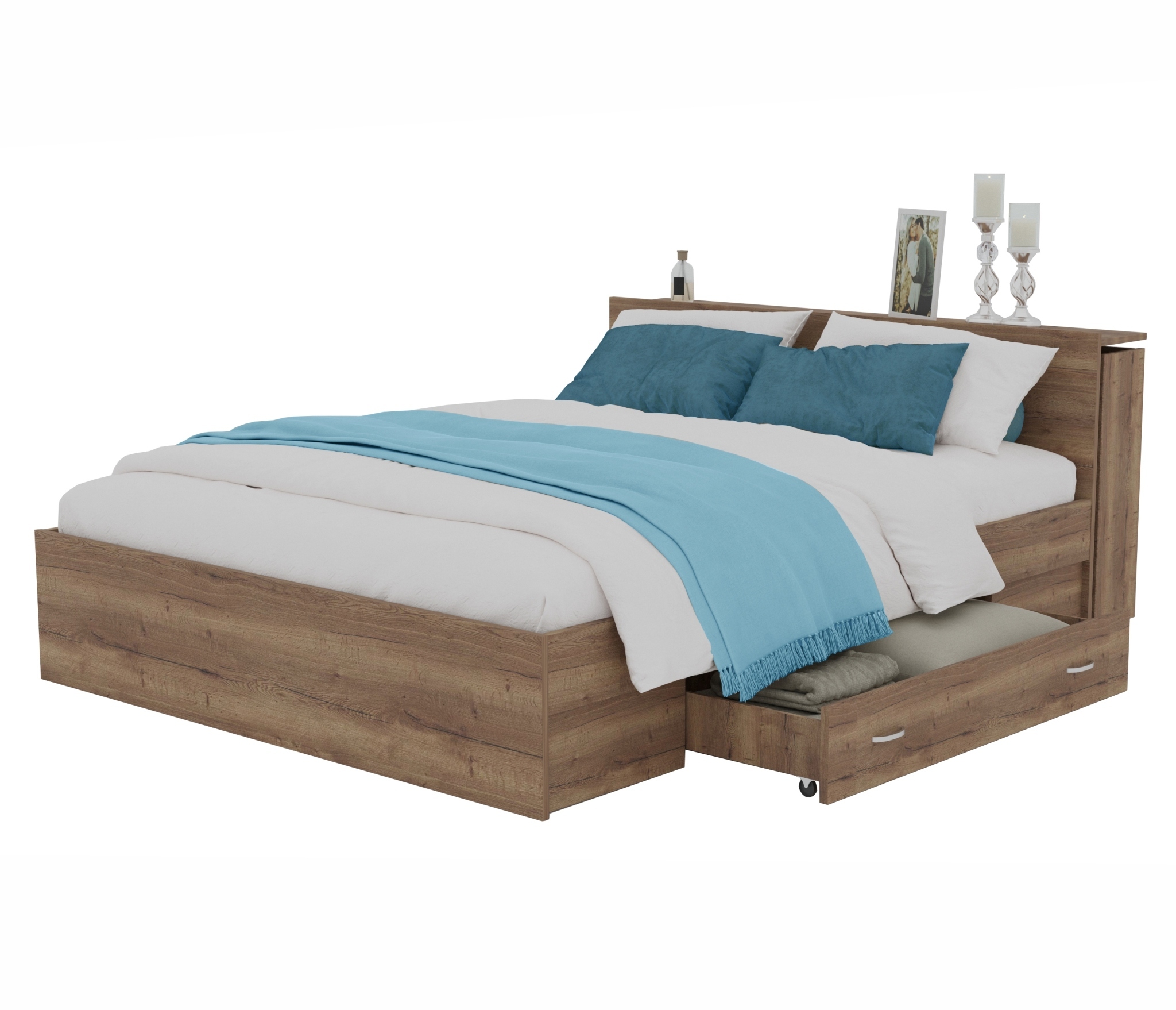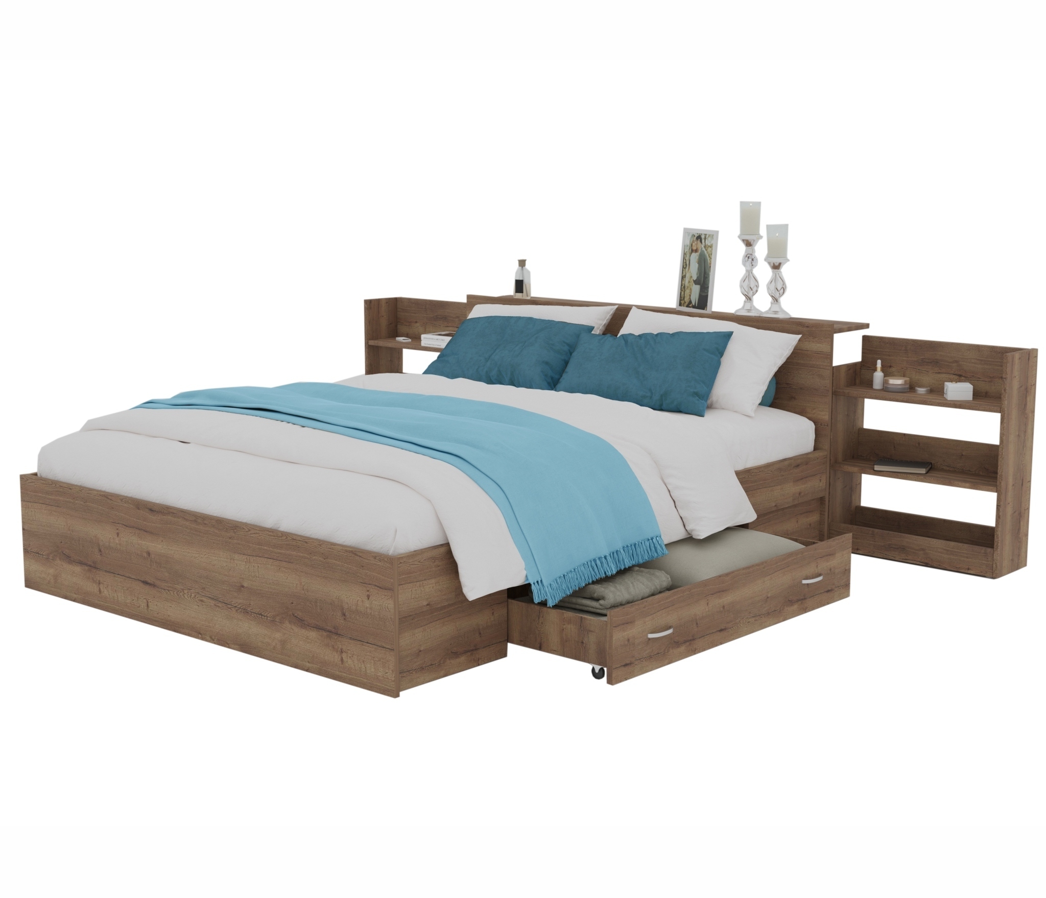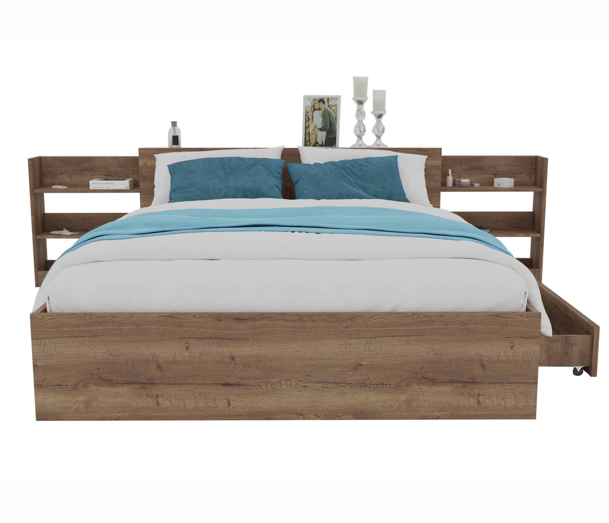 Двуспальная кровать Доминика 1600 с выдвижным блоком и 2 ящиками в модной скандинавской текстуре "дуб золотой крафт"- очень функциональный и незаменимый предмет мебели в спальне. Изголовье кровати дополнено двумя выдвижными блоками. Горизонтальные полки в блоках позволяют разместить необходимые вещи – книги, крема, зарядные устройства и прочите негабаритные предметы. К изголовью кровати крепится полка. На ней с легкостью можно расположить предметы интерьера, которые украсят вашу спальню. Благодаря функционалу, кровать может быть расположена в спальне как в раздвинутом виде, так и в задвинутом.