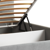 Кровать оснащена подъемным механизмом на газ/лифтах и вместительным ящиком для белья, что позволяет экономить пространство в спальне и обеспечивает дополнительное место для хранения постельного белья и других вещей.